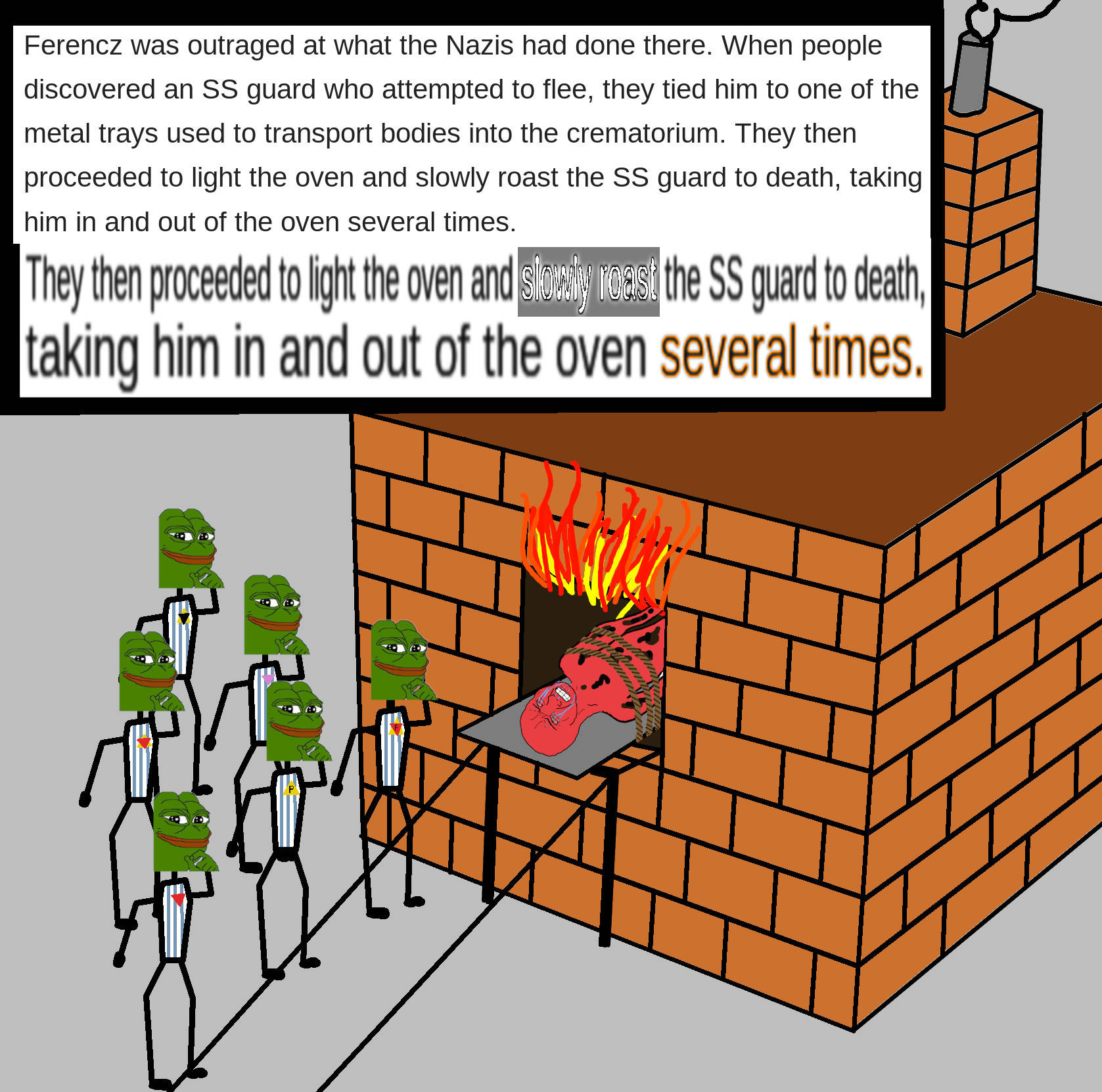 >>533518506>first Holocaust redpill is that montage of newspaper clipping from before ww2From 1898 through to 1945, and that's just the New York Semit. I mean Times.Other papers did it too.The second redpill is where it came from.The term Holocaust was lifted straight from the book of Exodus by the Zionists in the 19th century.It's a contamination of two Greek words, holos and caustos, meaning sacrifice burnt wholly.The chapter it's taken from describes what Noses did when he came back from the mountain carrying the Ten Commandments, and saw half the Habiru population had returned to the worship of the old Egyptian ("false" as per book) deities.He arrested them with the other half (whom stayed loyal in prayer and waited instead) of the Habiru, had them dig a big pit, filled it with various oils and fuels, set it on fire, and threw the heathens in it.It was a live fire sacrifice.The Holocaust burned them alive.Now then...What is the German effort of the Holocaust, rather famously?