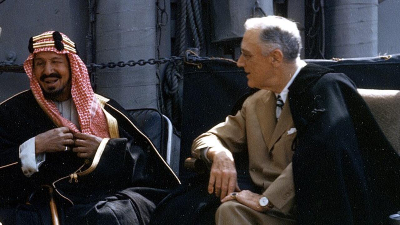 >Roosevelt and saudi king Ibn Saud deciding the post 1945 new World Order on the USS Quincy.