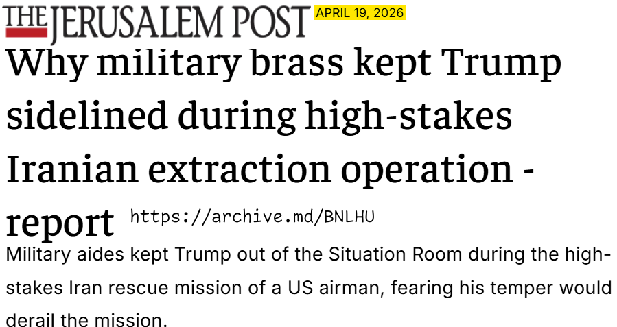 >>533290973WHY MILITARY BRASS KEPT TRUMP SIDELINED DURING HIGH-STAKES IRANIAN EXTRACTION OPERATION>Military aides kept Trump out of the Situation Room during the high-stakes Iran rescue mission of a US airman, fearing his temper would derail the mission.>The move came during a period of intense agitation for the president. Following the downing of a US jet by Iranian forces, Trump reportedly spent hours screaming at aides in a nearly empty West Wing, haunted by the specter of the 1979 Iranian hostage crisis. “If you look at what happened with Jimmy Carter... it cost them the election,” Trump privately fretted, according to sources familiar with the matter.>To mitigate the risk of impulsive interference, aides opted to provide the commander in chief with updates only at “meaningful moments,” rather than the minute-by-minute tactical feeds>However, the relief in the West Wing at the pilot's rescue was short-lived. By 2 a.m., the president had retired, only to wake six hours later and post a profanity-laced ultimatum on social media, threatening to leave Iran “living in Hell” unless the Strait of Hormuz was reopened.>Despite his bellicose public rhetoric and threats to “destroy Iranian civilization,” the report reveals that Trump remains the primary internal obstacle to a full-scale ground invasion. While advisers have allegedly assured the president a mission to capture Kharg Island would be a tactical success and secure the Strait of Hormuz, Trump has flatly resisted the plan. Citing a deep-seated fear of high American casualties, Trump reportedly told his team that US soldiers would be “sitting ducks” on the island. This private caution stands in stark contrast to his public persona; while he muses openly about awarding himself the Medal of Honor for his “bravery” during a flight into Iraqkekhttps://archive.md/BNLHU