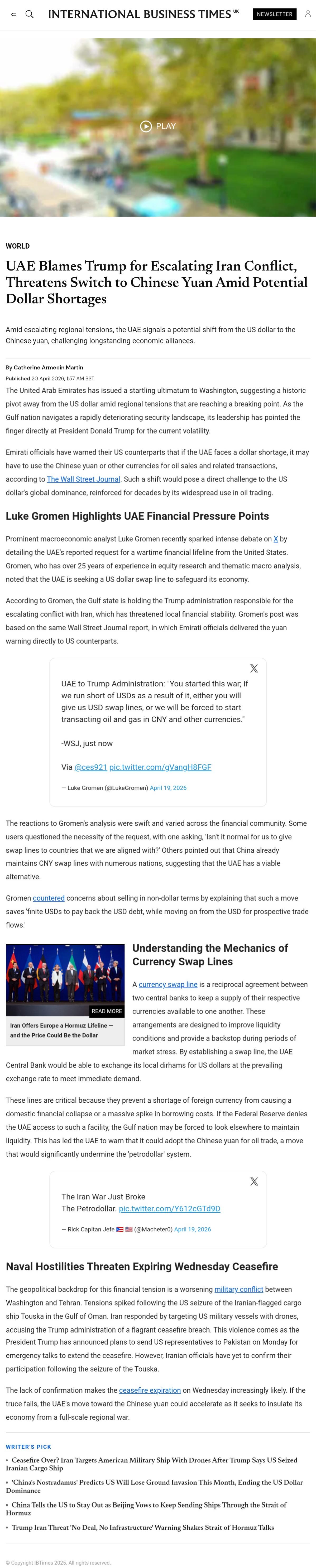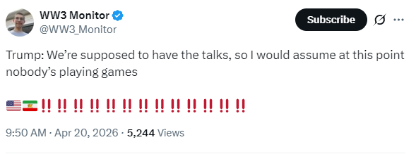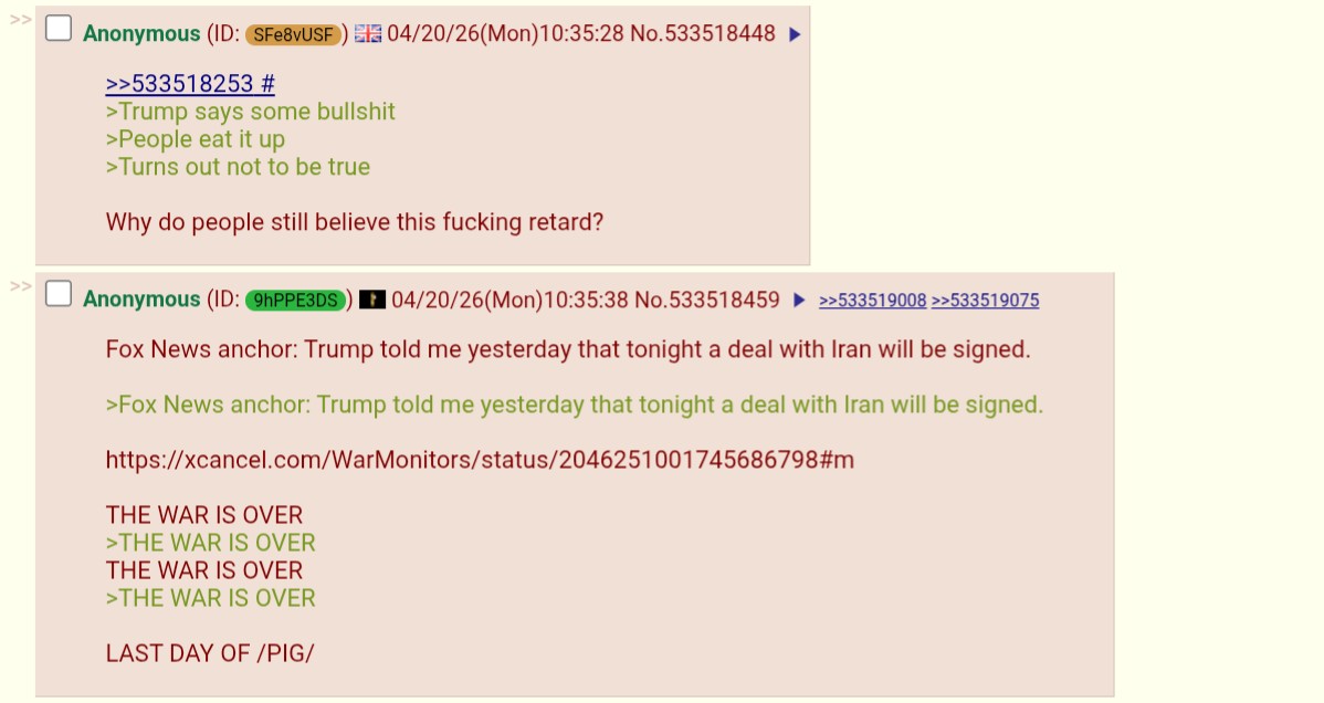 Previous: >>533508695Day: 13 of the 14-day Ceasefire™ period in IranDay: 51 of the 1-day Special Military Operation™ to decapitate IranDay: 4 of the 10-day Ceasefire™ in Lebanon▶RECENT:>Iran confirms US interdiction, seizure of Iranian vessel, says will retaliate ‘soon’>US Navy destroyer USS Spruance intercepted Iranian-flagged ship TOUSKA in Gulf of Oman. Vessel in US custody>Fars and Tasnim: Iran still has not confirmed they will attend the new round of talks in Pakistan>The White House: JD Vance will attend the new talks with Iran in Pakistan>POTUS to Fox News: If Iran doesn’t accept the deal, the entire country is getting blown up>Pool's closed>CNN, citing Iranian officials: A new round of US–Iran talks is expected to take place in Islamabad, Pakistan, on Monday, APR 20th>Intense Israeli artillery shelling of Khiam, Debbine and southeast Lebanon, less than 30 minutes into the ceasefire▶WARNING:>Do not trust any "happenings" without link/proof>Uкraine / Яussia discussions belong in uнg or cнug▶Thread Theme: "HE'S A PIRATE" - PIRATES OF THE CARIBBEANhttps://www.youtube.com/watch?v=yRh-dzrI4Z4▶Oil:>https://oilprice.com/oil-price-charts▶Kino:https://files.catbox.moe/og2wvv.mp4https://files.catbox.moe/dqr3fl.mp4https://files.catbox.moe/jg9rat.mp4https://files.catbox.moe/fx86zj.mp4https://files.catbox.moe/cbd7ug.mp4https://files.catbox.moe/2hwzcx.mp4https://files.catbox.moe/smmsfw.mp4https://files.catbox.moe/x0fbgv.mp4https://files.catbox.moe/86yxn2.mp4▶Live-streams:https://www.youtube.com/watch?v=4E-iFtUM2kkhttps://www.youtube.com/watch?v=TdcrT5OcS9chttps://www.youtube.com/watch?v=53G-Oy4r6M4▶Telegram Channelshttps://rentry.org/tgnews▶Israel Rocket Alertshttps://www.tzevaadom.co.il/en▶Air Traffichttps://www.flightradar24.comhttps://flightaware.com/livehttps://globe.adsbexchange.com▶Maritime Traffichttps://www.marinetraffic.comhttps://www.vesselfinder