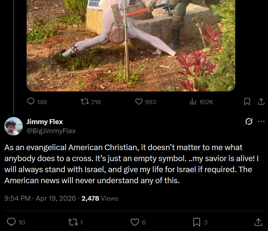 >>533517572We don't worship idols.A statute of Jesus Christ is merely a statue, not Jesus Christ.That being said, desecration of a statue of Jesus reveals everything that I need to know about the Jews, and I support all the proper outrage that this generates.When the Jewish state that calls itself Israel is destroyed by God, it will be justice.