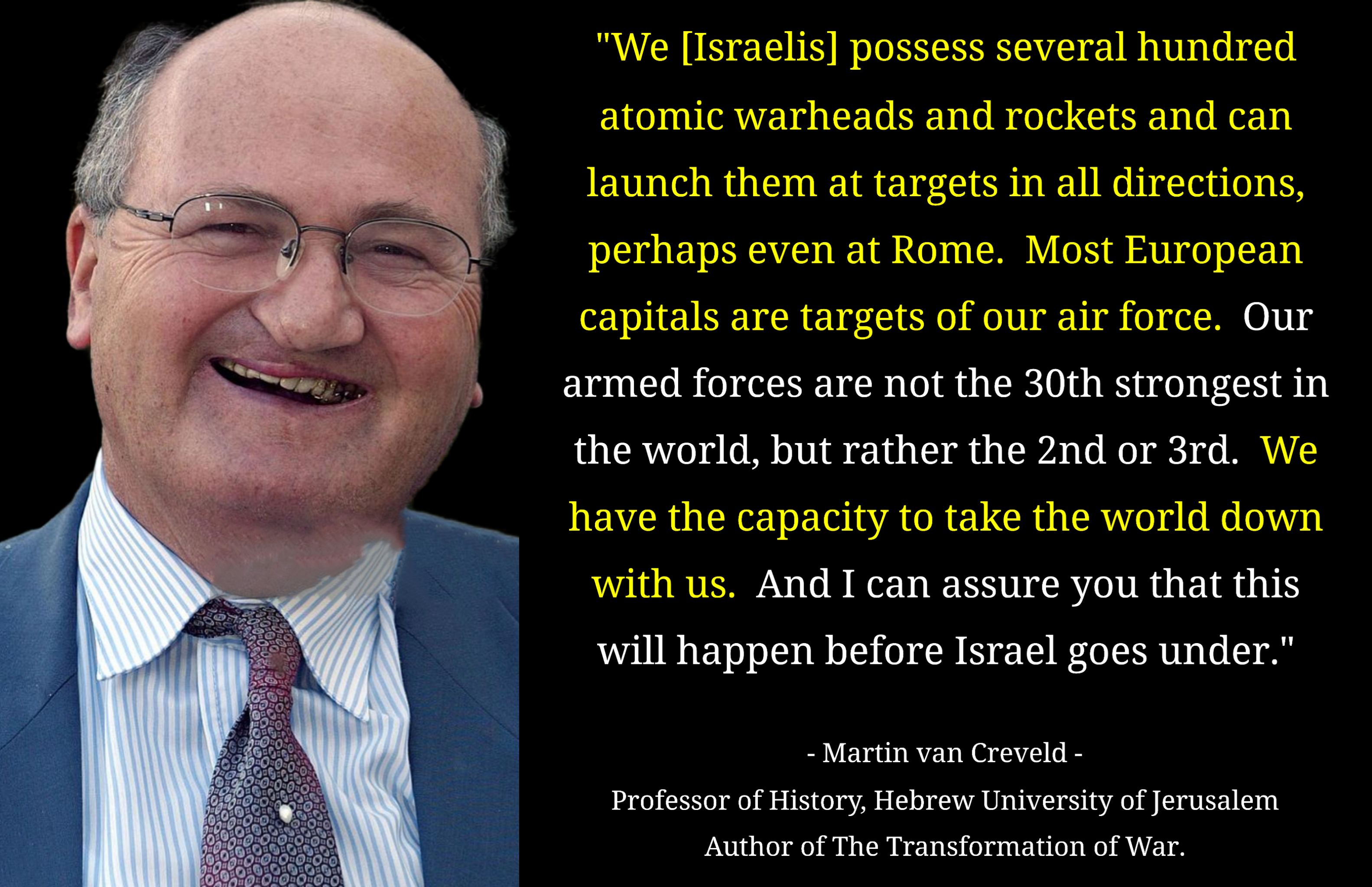 >>533527970>Pissrael couldnt even stop a bunch of ragheads penetrating their hippie festival.LOL. Israel created Hamas in the first place to thwart a two-state solution and justify subsequent Nakbas:>For years, the various governments led by Benjamin Netanyahu took an approach that divided power between the Gaza Strip and the West Bank — bringing Palestinian Authority President Mahmoud Abbas to his knees while making moves that propped up the Hamas terror group.https://www.timesofisrael.com/for-years-netanyahu-propped-up-hamas-now-its-blown-up-in-our-faces/>Brig. Gen. Yitzhak Segev, disclosing in 1981 that he had been given a budget for funding Palestinian Islamists to counter the rising power of Palestinian secularists. Hamas, a spin-off of the Palestinian branch of the Muslim Brotherhood, was formally established with Israel’s support soon after the first Intifada flared in 1987 as an uprising against the Israeli occupation of Palestinian lands.>Israel’s objective was twofold: to split the nationalist Palestinian movement led by Arafat and, more fundamentally, to thwart the implementation of the two-state solution for resolving the protracted Israeli-Palestinian conflict. By aiding the rise of an Islamist group whose charter rejected recognizing the Israeli state, Israel sought to undermine the idea of a two-state solution, including curbing Western support for an independent Palestinian homeland.https://www.japantimes.co.jp/commentary/2023/11/21/world/israel-failed-policy/And now, just to make things even more cartoonishly evil, Israel is insisting that the West take in the radicalized refugees:https://thehill.com/policy/international/4297914-israeli-lawmakers-urge-world-leaders-to-accept-gaza-refugees/It doesn't get much more geopolitically fucked than that. Even if you hate Palestinians, you should still resent Israel for trying to push the survivors onto us knowing damn well they're all now perma-jihadists.
