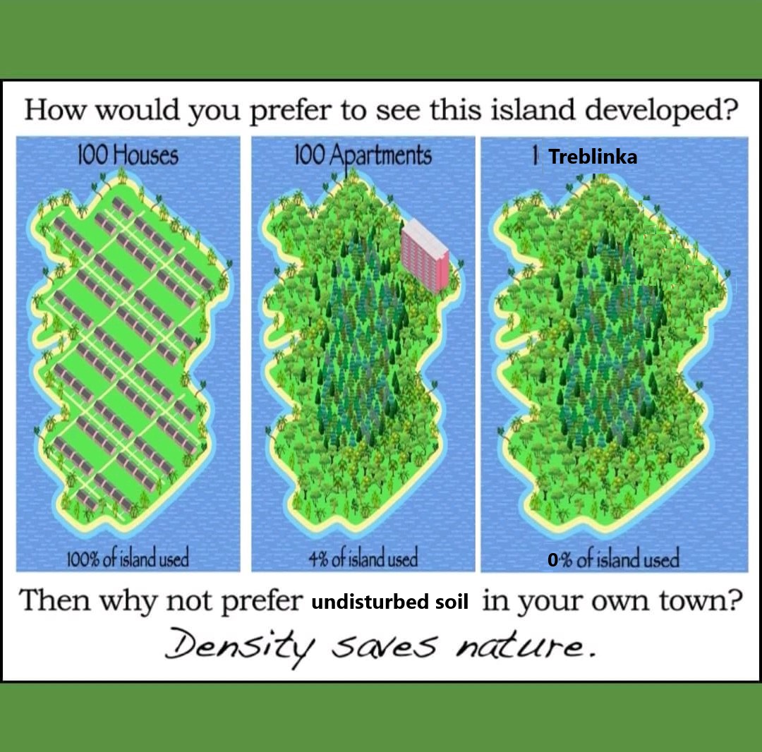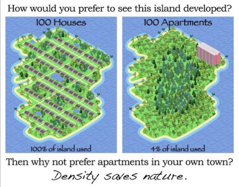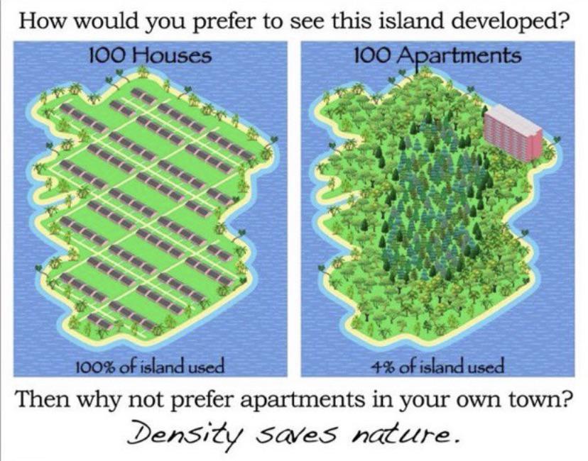 >>533530487The island doesn't have much for resources I imagine, so how are they going to build that tall apartment building? They could probably manage 100 houses out of their own timber and still grow more for maintaining, building other dwellings later. The tall building will require big machinery and concrete/metal to build, making them dependent on outside resources, outside people. Nevermind about maintenance. The pic is misleading anyways since such an island to exist perfectly to fit 100 houses like that would mean they are already pushing capacity on that small ass island. You can fit houses more dense then that and no island is that small. I get the allegory, but it's still ridiculous and any place in the world suggesting we need more high rises is usually high density cities that aren't any means optimal places for people to live, and there is tons of space outside of them in the country. It's just city dweller things, justifying their existence.