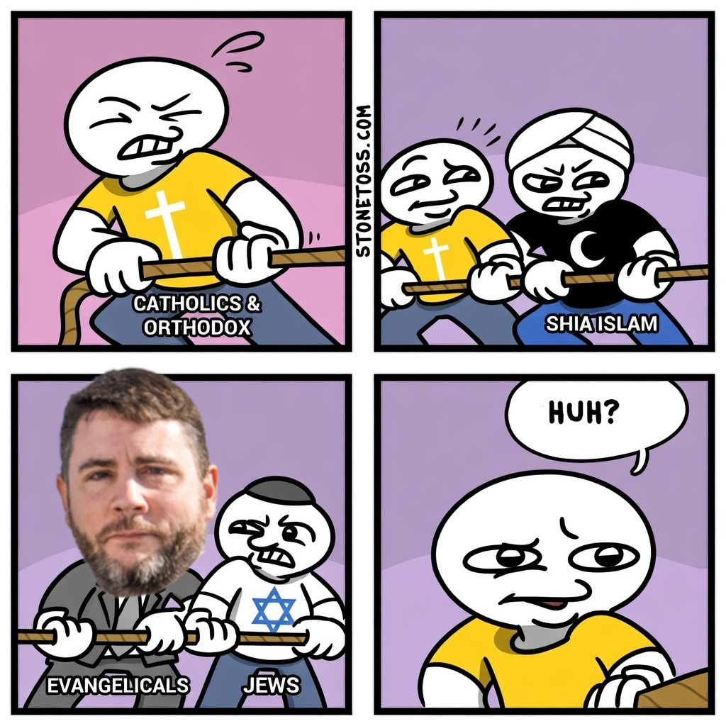 >>533545610Zionists can be kikes or not.The pic try to show how supposed Christians (Evangelicals) are sided with kikes against other Christians.