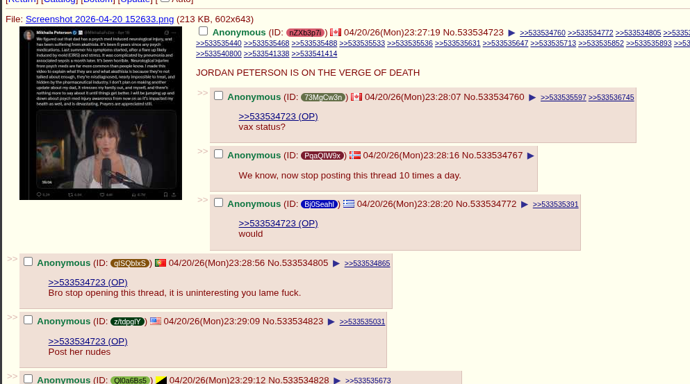 >>533541548>Then why Jordan Peterstein is dying?His daughter is probably poisoning him. Remember that she supposedly dealt with a mysterious illness for years until she cured it by eating carnivore. That was obviously fake. She seems obsessed with getting attention for medical issues. Her daughter also had a mysterious illness that nobody can identify.