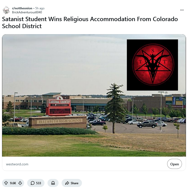 >>533541782However granting "religious accommodation" for SATANISM proves that Colorado government is made of satanists. Otherwise anyone else would have said no.