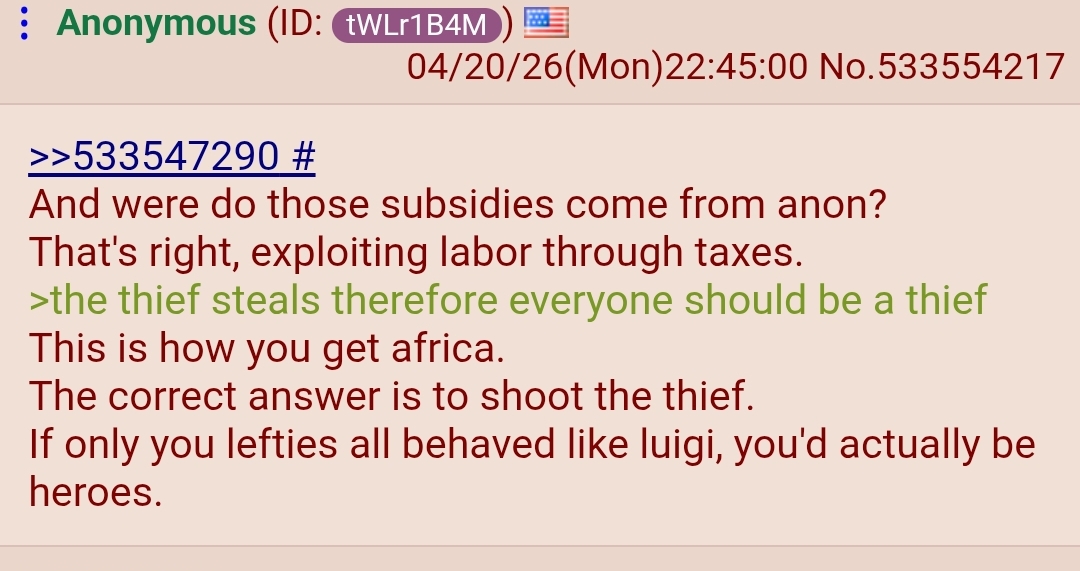 >>533547290And were do those subsidies come from anon?That's right, exploiting labor through taxes.>the thief steals therefore everyone should be a thiefThis is how you get africa.The correct answer is to shoot the thief.If only you lefties all behaved like luigi, you'd actually be heroes.