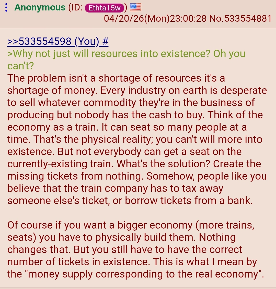 >>533554598>Why not just will resources into existence? Oh you can't?The problem isn't a shortage of resources it's a shortage of money. Every industry on earth is desperate to sell whatever commodity they're in the business of producing but nobody has the cash to buy. Think of the economy as a train. It can seat so many people at a time. That's the physical reality; you can't will more into existence. But not everybody can get a seat on the currently-existing train. What's the solution? Create the missing tickets from nothing. Somehow, people like you believe that the train company has to tax away someone else's ticket, or borrow tickets from a bank.Of course if you want a bigger economy (more trains, seats) you have to physically build them. Nothing changes that. But you still have to have the correct number of tickets in existence. This is what I mean by the "money supply corresponding to the real economy".
