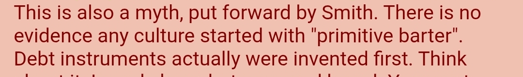 >>533556506>It's the other way. The problem with the USA is that it has printed too much money. The government budget is now 40 trillion dollars with interest payments at 1 trillion every year.It sounds like you still believe in financial intermediation theory. Look up Richard Werner and credit creation. Money (currently) is created from nothing when loans are extended. This means the money supply is equal to the principal on all the debt. But that debt has to be paid with interest. This means that no matter how much you print, you're always in a perpetual shortage. An important component of UBI/social credit is that the treasury retakes power to issue currency back from the banks (and contrary to what Marx wanted with a central bank) and creates the necessary money debt-free.>Money is just a tool to make bartering more efficient. This is also a myth, put forward by Smith. There is no evidence any culture started with "primitive barter". Debt instruments actually were invented first. Think about it: I need shoes but you need bread. You want need shoes again for months, but need bread every day? How can we use barter in such a situation? You can't; you use IOUs.
