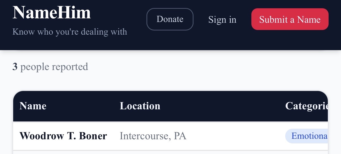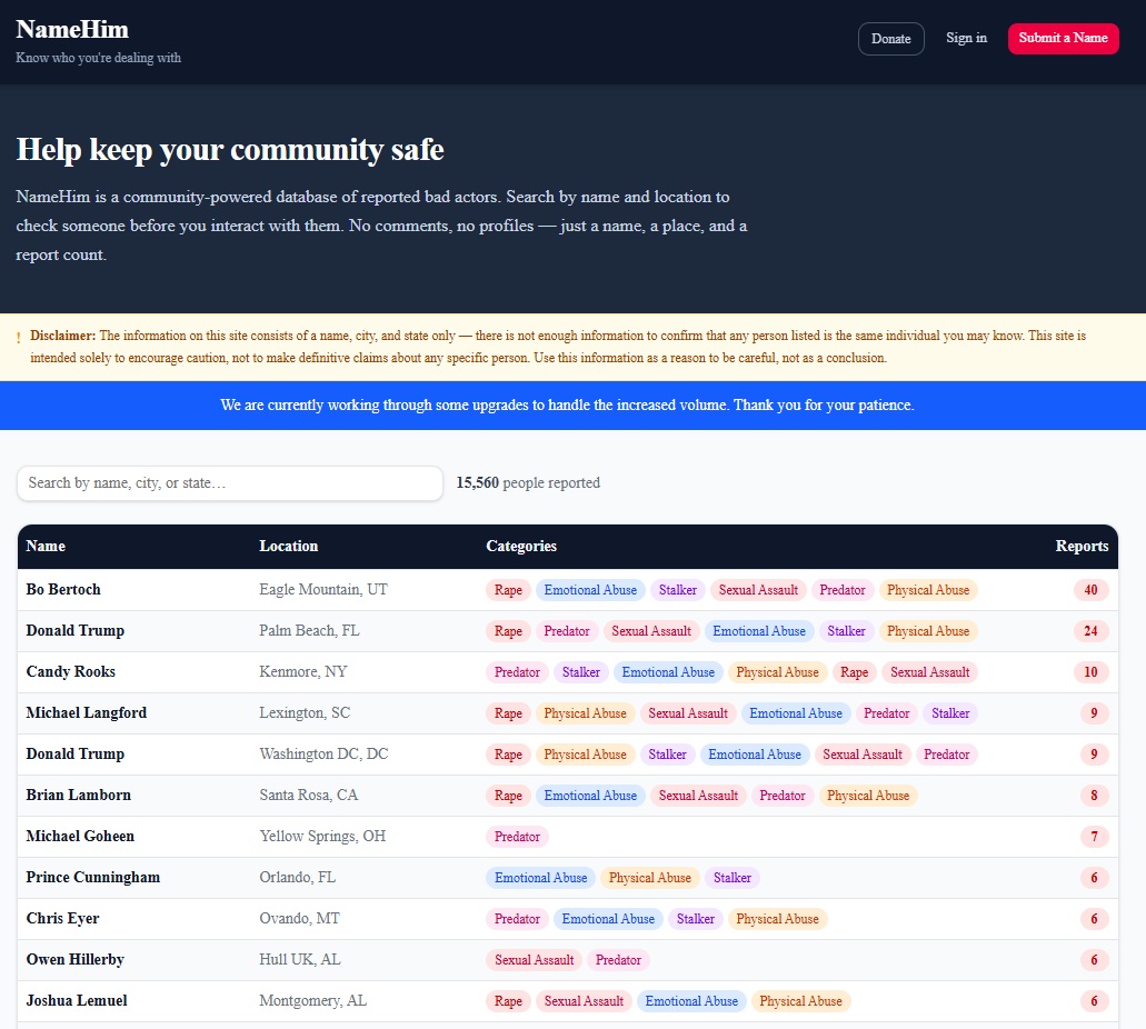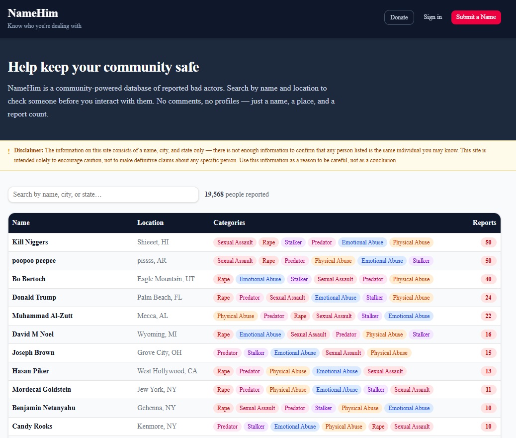 A website (https://www.namehim.io/) where alleged rapists can be posted with their name and last known location.Said to be a 'bad actor database' so women can put information out on men that harm them.Who's willing to bet it hasn't even been 24 hours before some vindictive bitches put their exes on there over perceived slights or complete fabrications?Discuss.