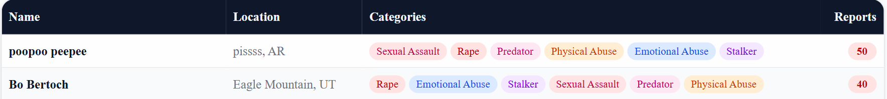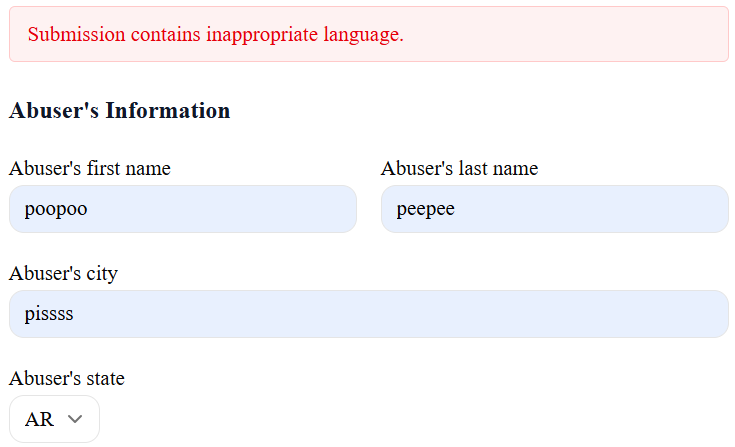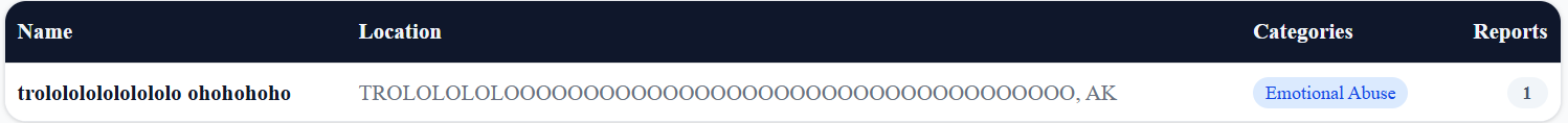 >>533545364Emotional Abuse is literally on there. We have people claiming that reading mean tweets causes PTSD and men not putting up with psycho bullshit is "abuse". Even then, every time shit like this shows up, it's the same things. "False Accusations are low". Police reports are low because people generally stop at lying to the police.People lie to the internet literally all the time. This may be my favorite part:>"To request removal under a valid court order, contact us."So putting someone's name on the site with no further proof or verification is perfectly reasonable. But if someone is actually being abused by their name being put wrongfully on the site, well...that requires a fucking court order, which means a public record, which means you then have it out there that you sued to take your name off it, which guarantees the idiot masses think you're doing it because you're hiding something.