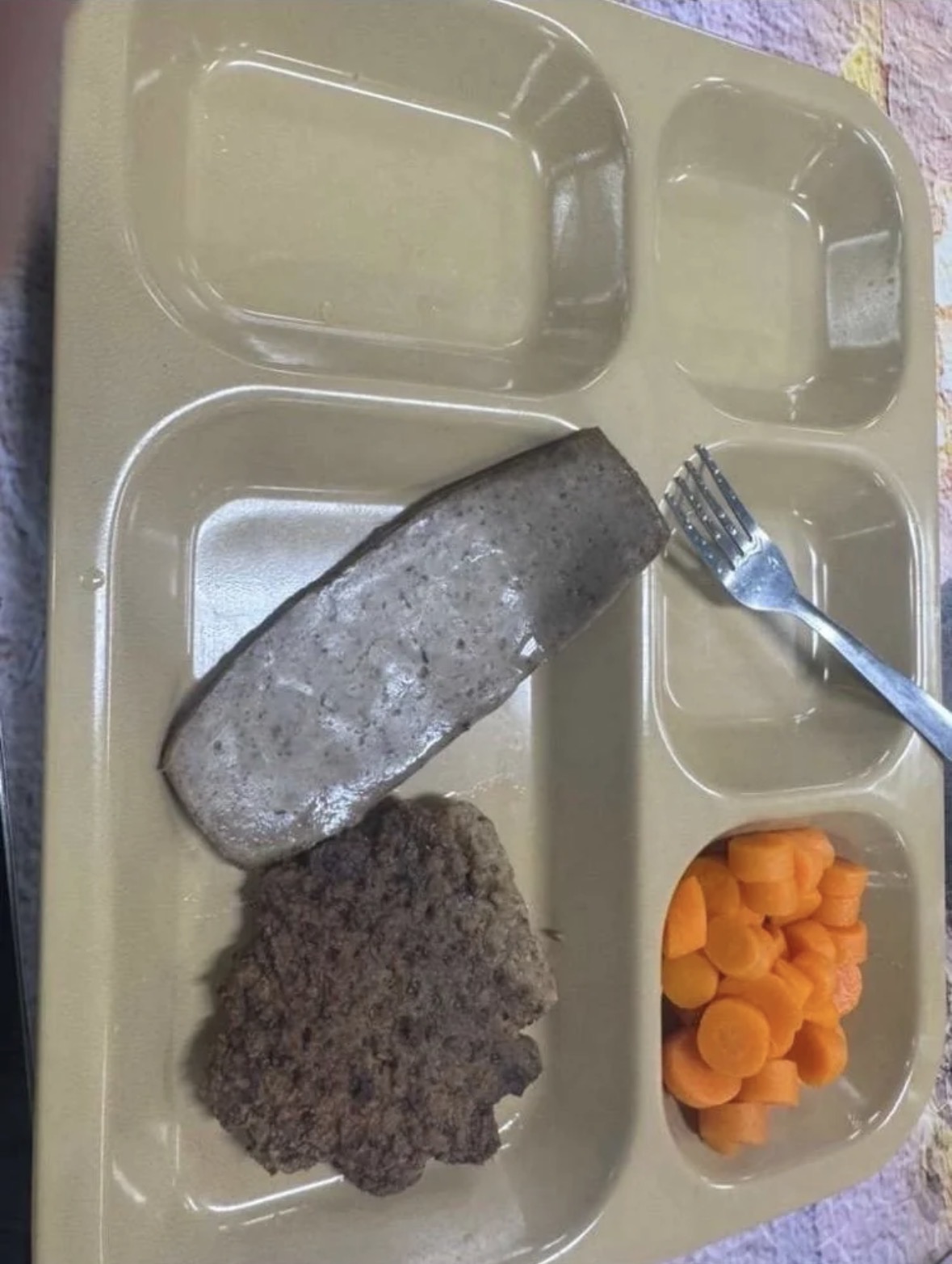 >>533545103Brown round shaped item is some kind of burger and whatever is on top some kind of synthetic meat and the side dish is chopped carrots that's steamed or boiled it looks like prison food