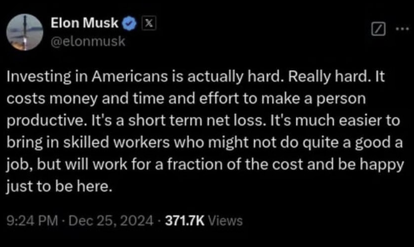 >>533555358>unlike the USA where you literally don’t need any documentation to live and work in most cities which is insane.yes, we lack the counter-infrastructure which supports such activities. most of that is influenced by the big businesses which use illegals en masse, like agriculture and meat packing plants such as tyson chicken. these people have huge huge clout, they took over the us department of health this past election too. notice that trump is ok with farm workers? all the republicans that campaign on getting illegals out end up doing some sort of amnesty, and it's because of political pressure.this is class warfare in action. the illegals drive down not just wages, but safety and workplace standards for everyone else. you can't compete against them. they know illegals will put up with horrifying conditions that us citizens won't or shouldn't. rather than importing slaves, and having to watch over them, house them, keep them from escaping, or even transporting them to the us, all of which costs money, you can ruin the economies of the third world, and encourage their desperate people to go to the us on their own money. they pay their own food, lodging, transportation, everything.and the government gets their cut too. they use dummy ssns to pay payroll taxes for their employees, but since the numbers aren't legit, they can't get refunds. so unless they are fully under the table they pay lots of tax too.https://www.youtube.com/watch?v=8X0UmfBwA_U>>533555529so no argument. and it's the brave ai search.