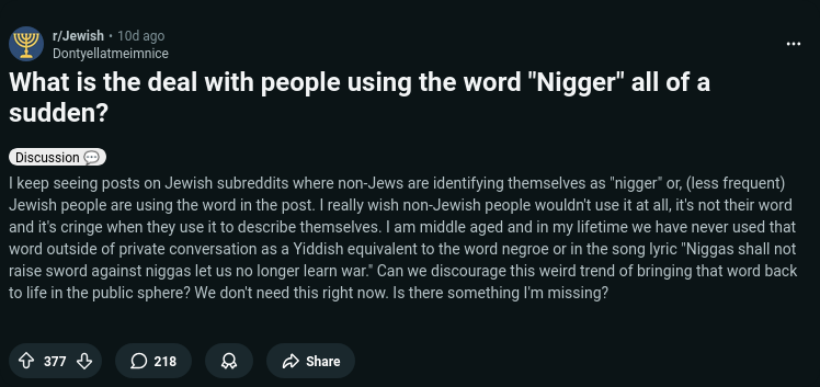 >everyone keeps using it to refer to their fellow goyim as a sign of brotherhood under the yoke of shared oppressors>over time it becomes unacceptable for Jewish folk to use the word for practically any reason whatsoever