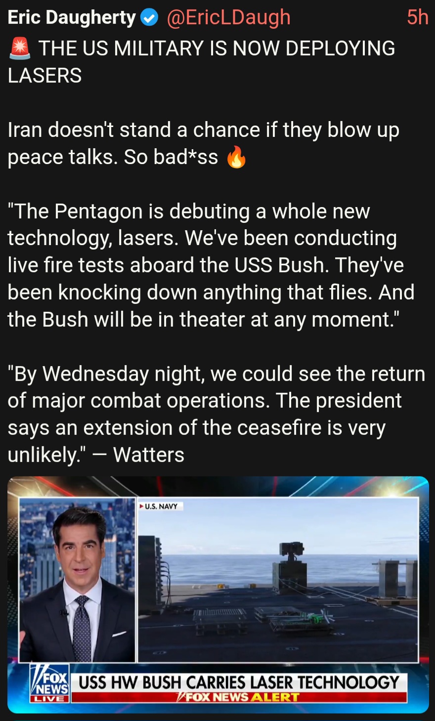 >Marandi: US should announce lifting of naval blockade>Marandi: There is no sign of Tehran's willingness to participate in negotiations with the US in Pakistan.>I believe that one of Iran's demands is a public statement by the US that the naval blockade will be lifted before the negotiations begin.Either the drumpfster caves to all Iran demands, or war resumes tomorrow night