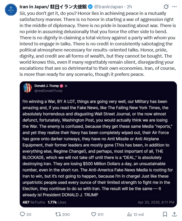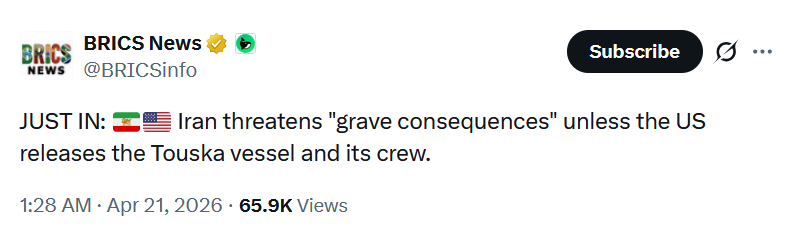 >Iran's Foreign Ministry issues statement condemning US attack on commercial vessel and abduction of crew and families:The Ministry of Foreign Affairs of the Islamic Republic of Iran strongly condemns the “criminal and illegal” attack by the United States on the Iranian commercial vessel Touska in the Sea of Oman, near Iran’s territorial waters.>The vessel was targeted in a “piratical act” that violated international law, the UN Charter, and a recent ceasefire agreement.>The crew and their families were intimidated and taken hostage during the incident.>The United Nations, the Security Council, and the International Maritime Organization must immediately condemn the attack and take urgent action to secure the release of the vessel and all those on board.>The United States will bear full responsibility for the consequences of the dangerous escalation, and Iran will use all available means to defend its sovereignty and protect the rights of its citizens.Doesnt look like talks are happening unless America ends its blockade