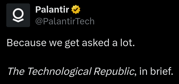 They're the only ones willing to save the West>4. The limits of soft power, of soaring rhetoric alone, have been exposed. The ability of free and democratic societies to prevail requires something more than moral appeal. It requires hard power, and hard power in this century will be built on software.>6. National service should be a universal duty. We should, as a society, seriously consider moving away from an all-volunteer force and only fight the next war if everyone shares in the risk and the cost.>14. American power has made possible an extraordinarily long peace. Too many have forgotten or perhaps take for granted that nearly a century of some version of peace has prevailed in the world without a great power military conflict. At least three generations — billions of people and their children and now grandchildren — have never known a world war.>15. The postwar neutering of Germany and Japan must be undone. The defanging of Germany was an overcorrection for which Europe is now paying a heavy price. A similar and highly theatrical commitment to Japanese pacifism will, if maintained, also threaten to shift the balance of power in Asia.>21. Some cultures have produced vital advances; others remain dysfunctional and regressive. All cultures are now equal. Criticism and value judgments are forbidden. Yet this new dogma glosses over the fact that certain cultures and indeed subcultures . . . have produced wonders. Others have proven middling, and worse, regressive and harmful.>22. We must resist the shallow temptation of a vacant and hollow pluralism. We, in America and more broadly the West, have for the past half century resisted defining national cultures in the name of inclusivity. But inclusion into what?https://x.com/PalantirTech/status/2045574398573453312