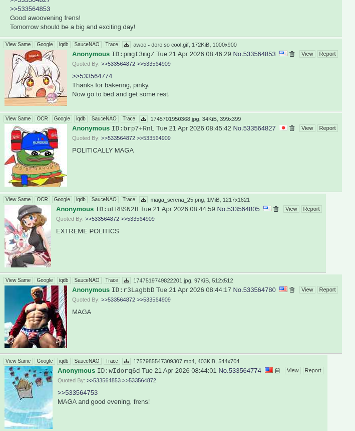 And with that, I'm off to bed. Goodnight, frens! Have fun making more shills cry and remember to stay hydrated while you're salt mining! It's gonna be a very MAGA day!Also, a new baker is now needed.>>533564945You're welcome! Have a good night!