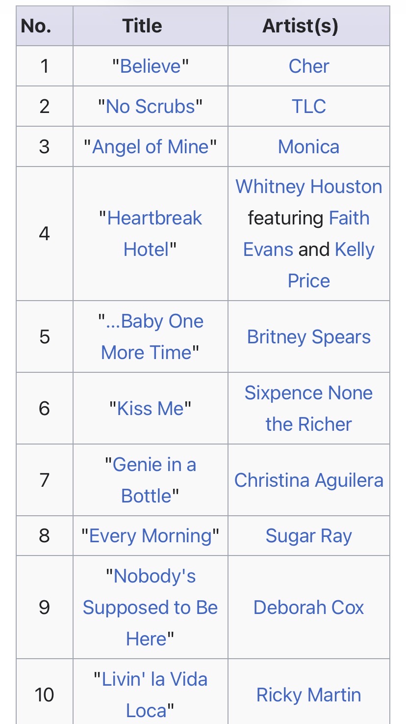 >>533565013What’s popular is all manufactured. Billy Corigan talked about it recently, and I noticed it in the early 2000’s. It was like a switch went off and the popular genres of music changed overnight.Rap had been around since the 80’s but didn’t completely dominate until the late 90’s. And nigger pop was everywhere (anyone over 40 has “Don’t Go Chasing Waterfalls” memorized because it was played on the radio every 10 minutes). It was stark, and obvious. By the mid 2000’s producers stuck to algorithms and known money makers. They wouldn’t invest in someone who simply had “it.” They stuck to what they knew was profitable. So we had several decades where popular music basically stagnated.If you were a teenager in 1999, and didn’t like divas or pop music, what would you have done? Pic are the top ten from that year, and the entire top 100 is similar. Keep in mind this predates the internet. This was driven purely by lazy consumption.