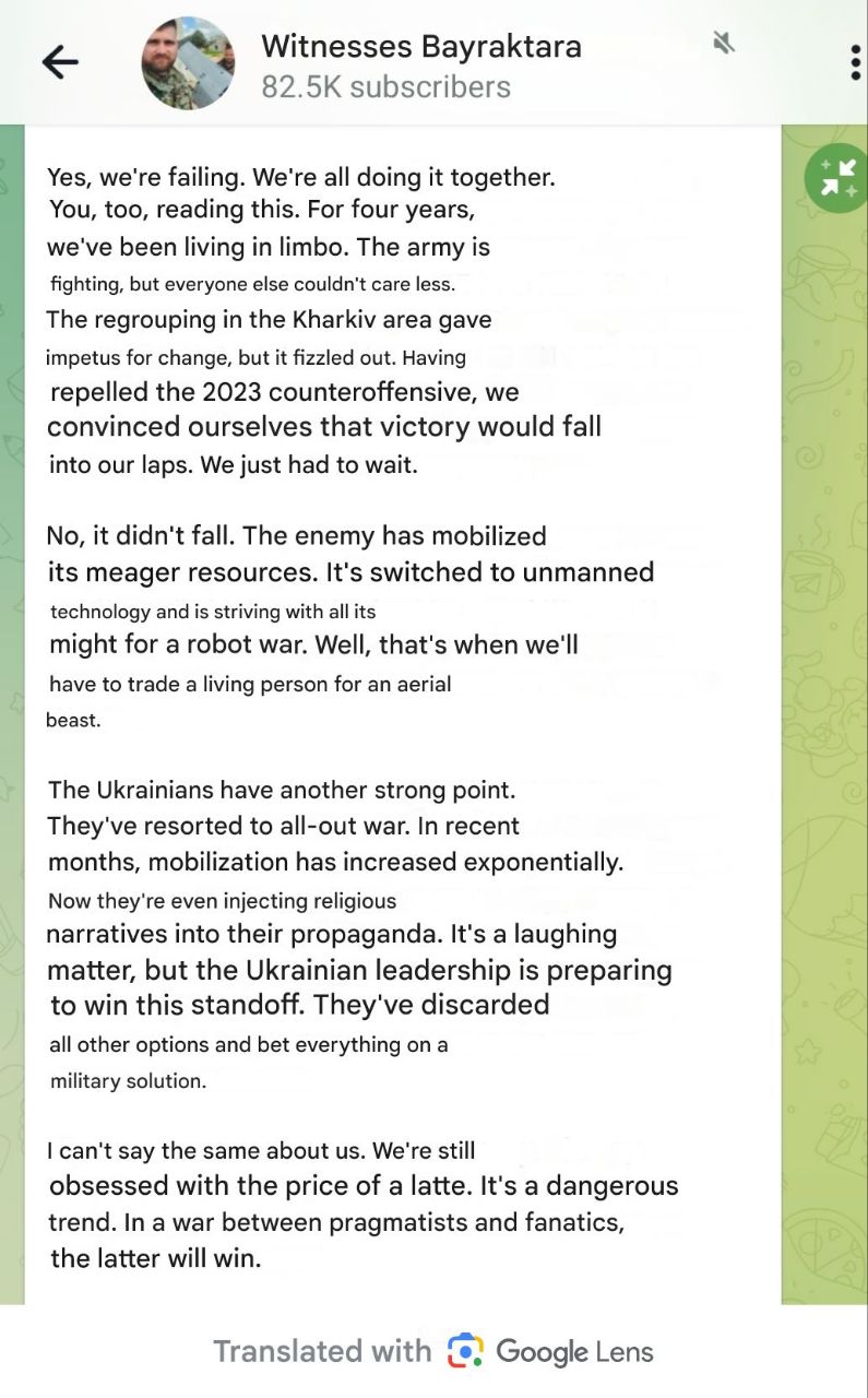 Every milbloggers is reporting about the extreme difficulty on the frontline. It's extremely difficult to advance without colossal losses because of the drones. Ukraine has now more drones than Russia.Good job cucktin, your "demilitarization of Ukraine" is going well!
