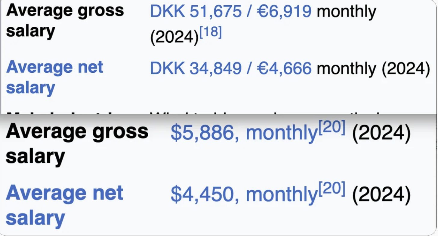>>533571604Salaries are listed herehttps://en.wikipedia.org/wiki/Economy_of_Denmarkhttps://en.wikipedia.org/wiki/Economy_of_the_United_States