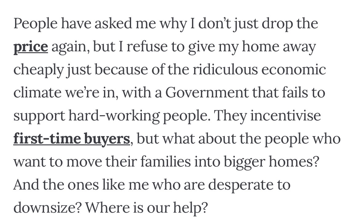 https://inews.co.uk/inews-lifestyle/trapped-850000-family-house-cant-sell-4351737>People have asked me why I don’t just drop the price again, but I refuse to give my home away cheaply just because of the ridiculous economic climate we’re in, with a Government that fails to support hard-working people.