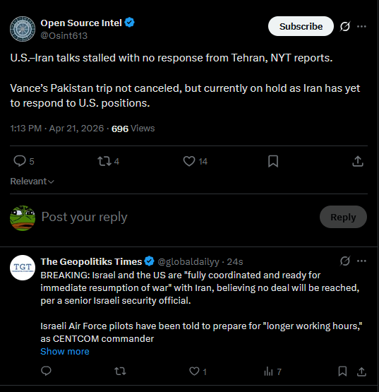 Al Jazeera just reported that the President, the Vice President, the Secretary of War, and the Chairman of the JCOS are meeting right now at the White House.