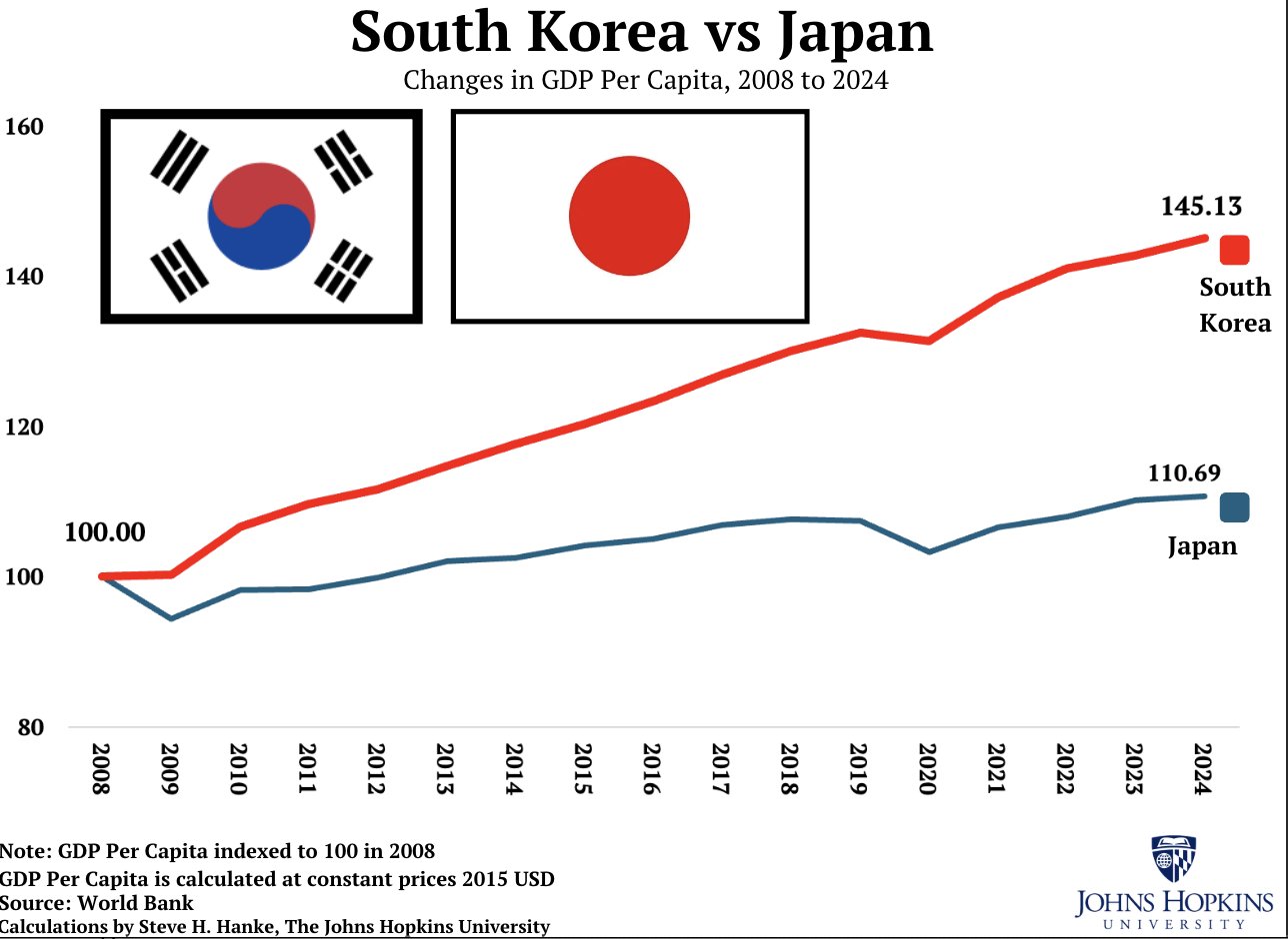 >South Korea overtook Japan around 2024–2025 in nominal terms, with the gap widening slightly in projections (Korea ~5–12% ahead in some 2025–2026 figures). This reverses the historical pattern where Japan was far ahead (e.g., nearly 4x higher in 1990).Japan is a dead man walking. It will fade into irrelevance once all the older generations retire.