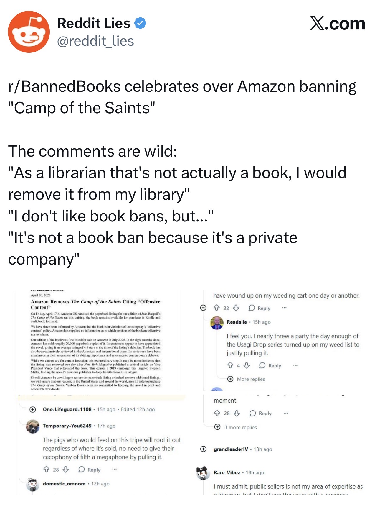 That's obvious by the fact that r/banned_books only has like 5 rules, and one of them is not white supremacist literature.