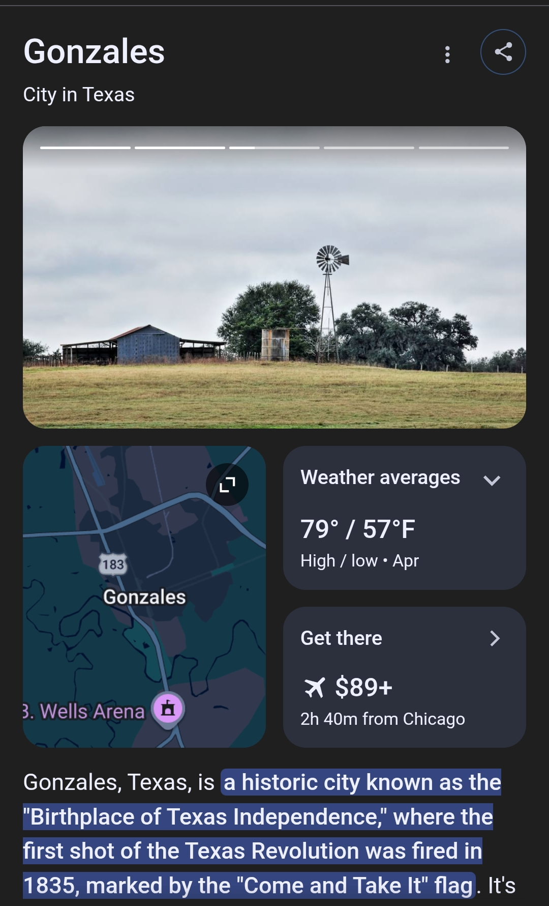 >>533592567Gonzales is a city in the U.S. state of Texas, with a population of 7,165 at the 2020 census.[6] It is the county seat of Gonzales County.[7] Gonzales was the site of several integral events in the Texas Revolution, including the Battle of Gonzales, the "Come and Take It" incident, the ride of the Immortal 32 to the Battle of the Alamo, and the subsequent Runaway Scrape.Gonzales is one of the earliest Anglo-American settlements in Texas, the first west of the Colorado River. It was established by Green DeWitt as the capital of his colony in August 1825. DeWitt named the community for Rafael Gonzáles, governor of Coahuila y Tejas.[9]