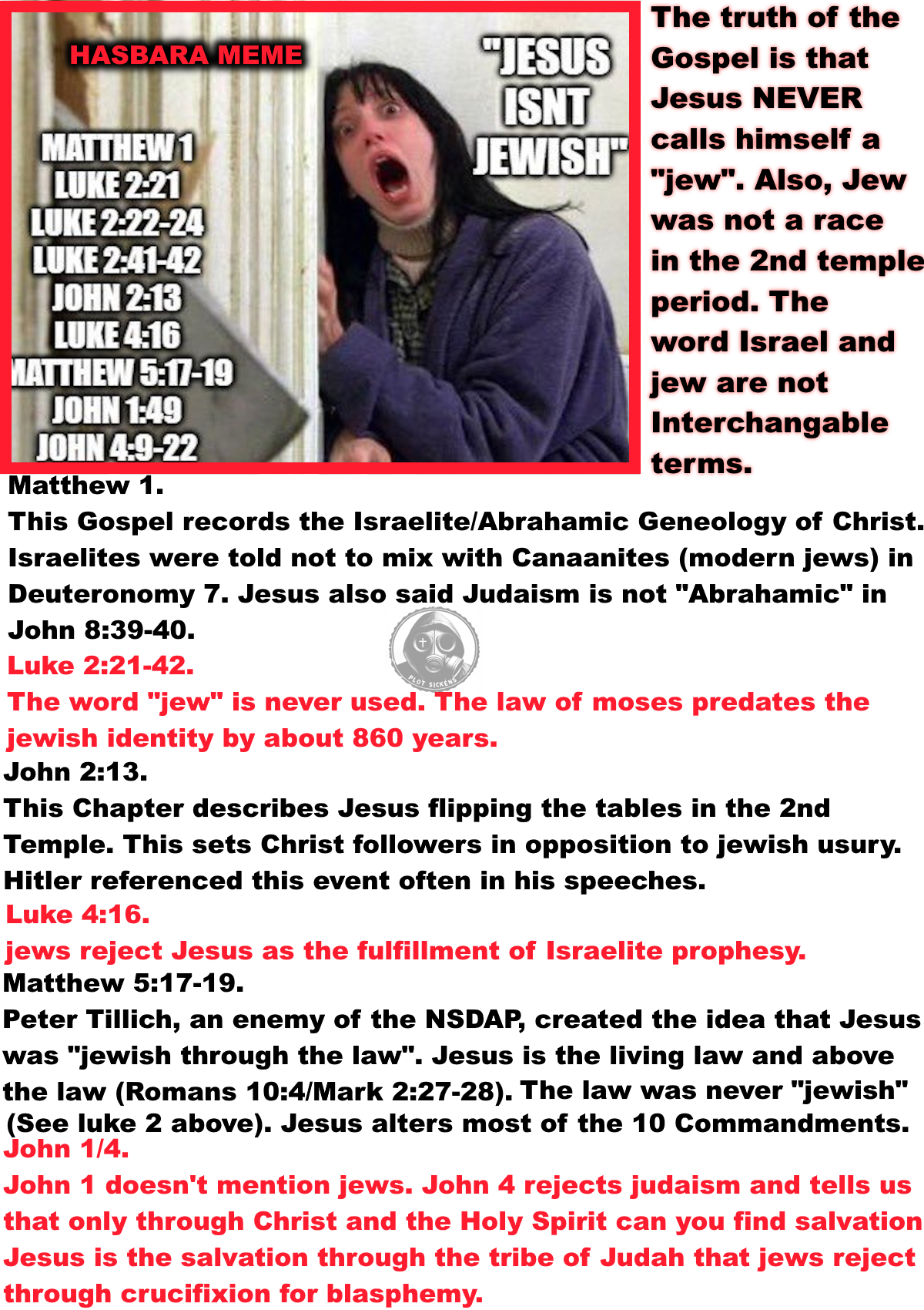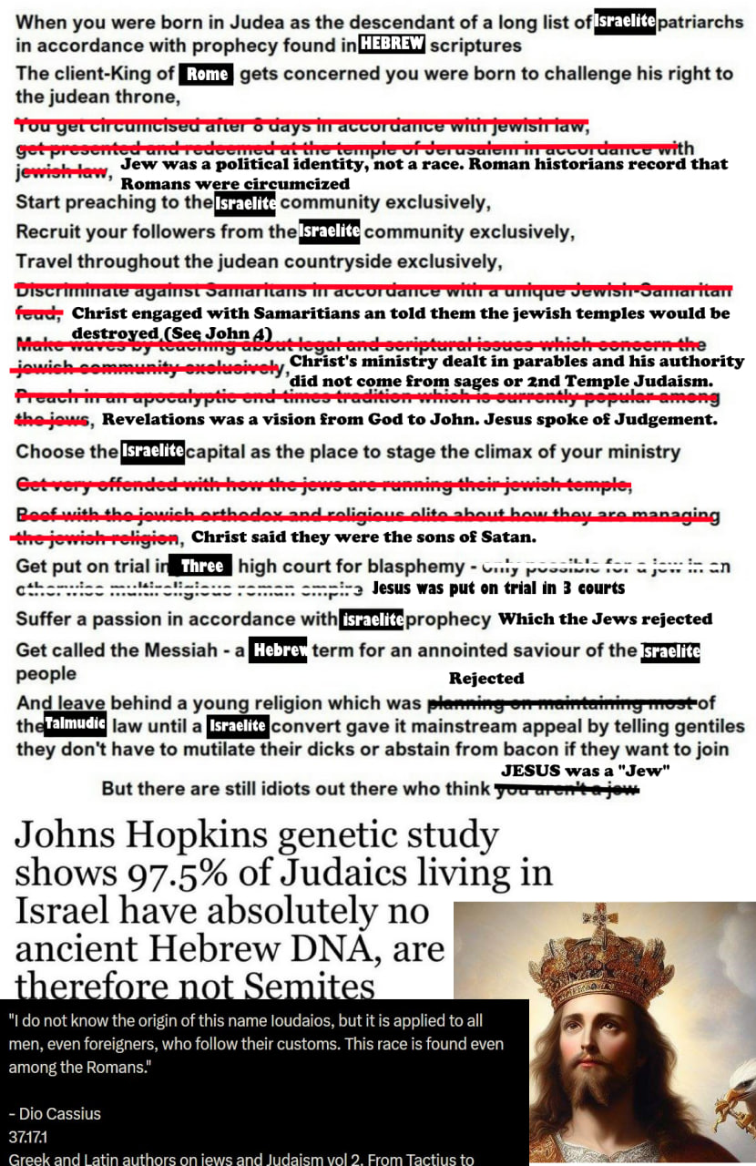 >>533598675> Jesus never calls himself a jew.> jew isn't a race in the bible retard.> David and Abraham were israelites, not jews> Synagogues didn't exist until after 70 AD.> Proof texting> The torah didn't exist until 1850> Mocking him> Josephus said jews existed after babylon> Jews are a failed israelite sectThis is just zionist propaganda created by JIDF agents who hate White people.You will be put in a camp.