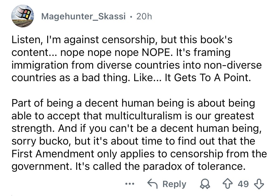I think they’re conflating shadow banning with outright banning. The first type is, they just won’t print them anymore, but you can certainly own the books and sell them amongst yourselves if you want. I don’t know about the copyright issues though if you want to make duplicates. Outright banning is completely different.