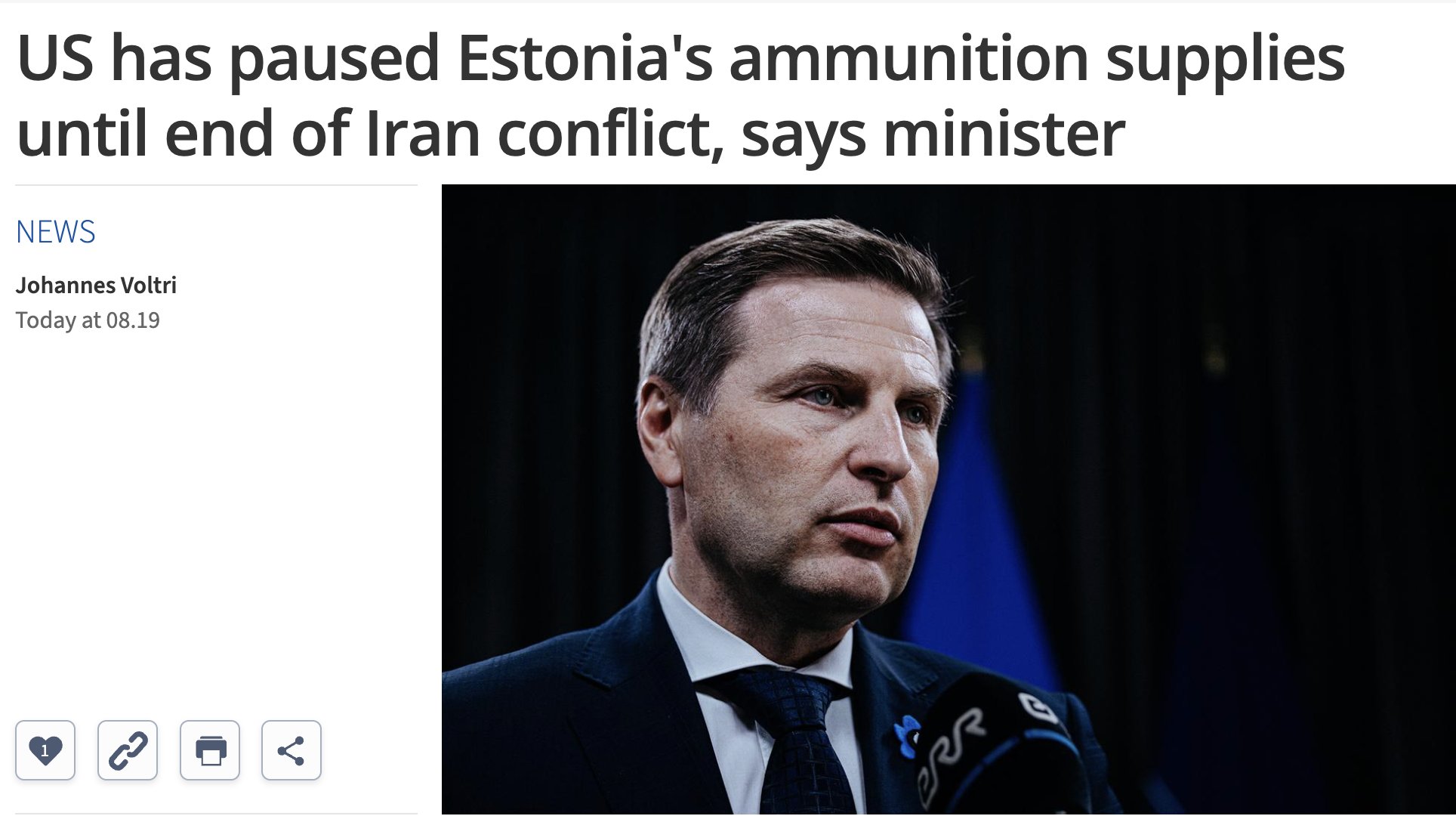 he U.S. paused ammunition deliveries to Estonia (especially HIMARS rockets) due to the war with Iran, likely for months, not weeks. Estonia says it has enough anti-tank weapons but may seek alternatives or rethink purchases if delays continue. Source: ERR