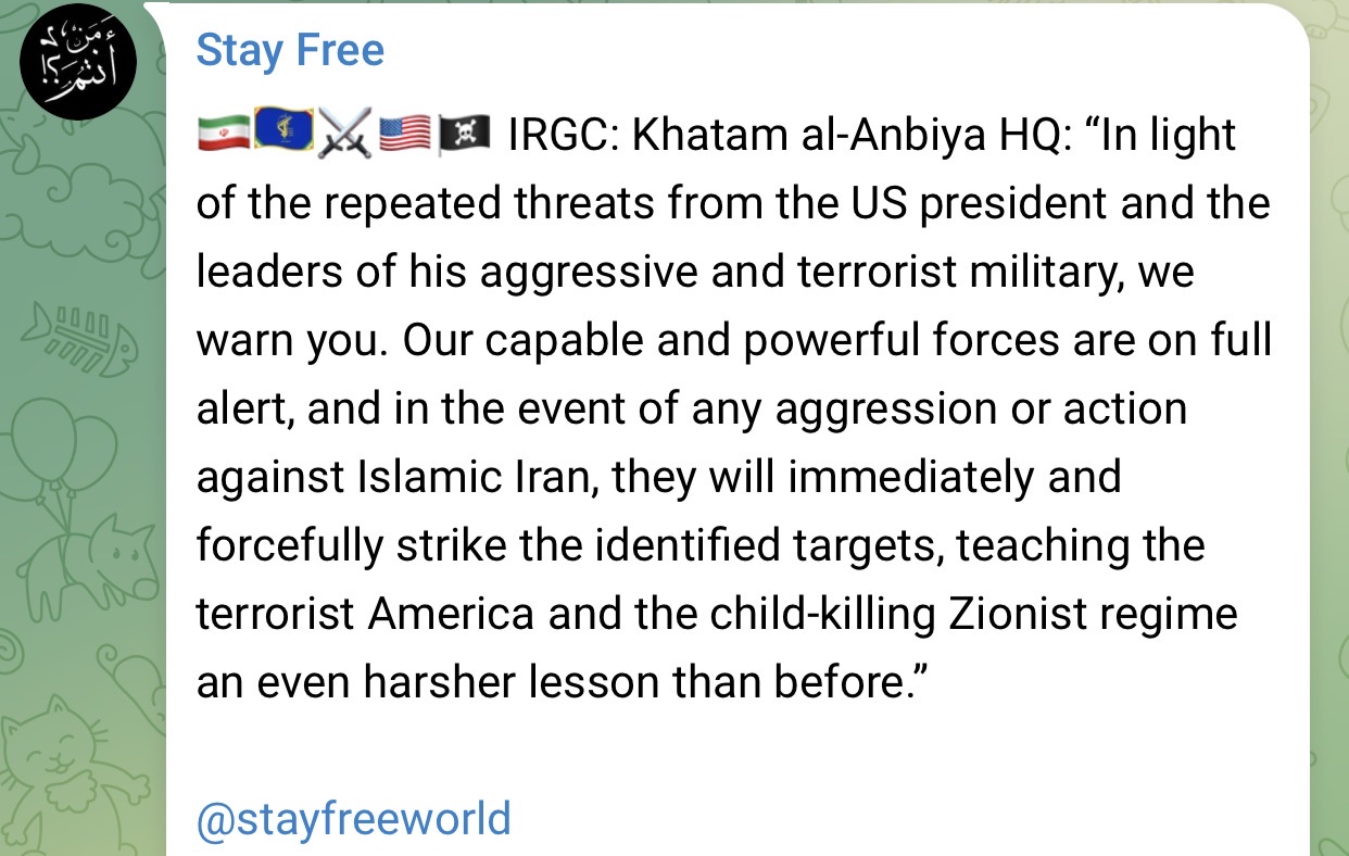Iran: In light of the repeated threats from the US President, we warn that our forces are on full alert with their finger on the trigger. In the event of aggression or any action against Iran - they will strike with force the pre-determined targets, and teach the US and the Zionist regime a harsher lesson than ever before.