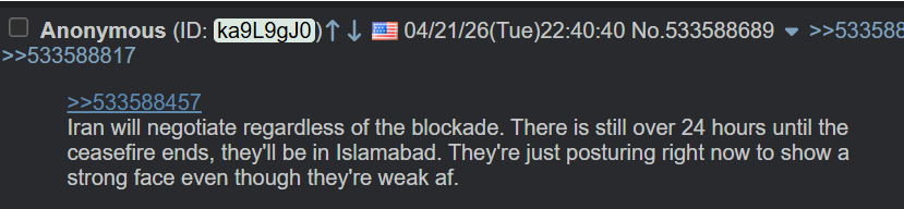 The Iranian strategy has been to stranglehold the global supply chain until the world at large feels the physical effects. Due to fake and gay US market economics they've managed to market manipulate and kick the can down the road about another 2 weeks (unironically) before oil shortages get actually priced in. They are setting up to end it by then, do not let them. They believe they'll win in two weeks, and will likely do something drastic to see that accomplished. They clearly aren't ready yet to execute just yet, don't let them get ready. Hit them so hard in the next day that they have to abandon the plan and negotiate in earnest