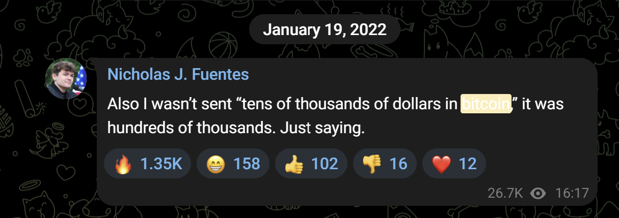 >>533610187>>Nick Fuentes received $400,000 Bitcoindam, fed posters were 100% right again
