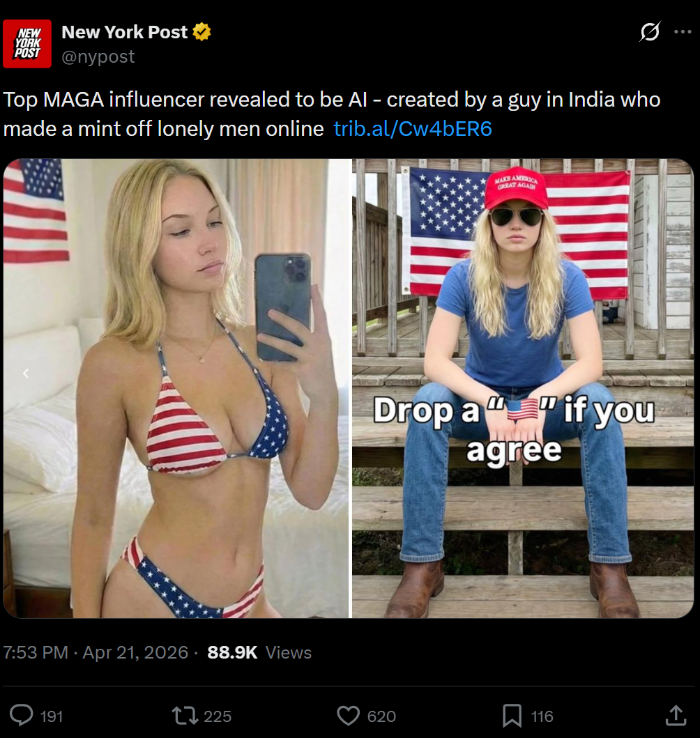 >Despite MAGA fans making him rich, he still looks down on them, calling them “super dumb.”>He said he also attempted to make a liberal counterpart for Hart on Instagram, but “Democrats know that it’s AI slop, so they don’t engage as much,” he said.>“The MAGA crowd is made up of dumb people—like, super dumb people. And they fall for it,” Sam said.fell for it again