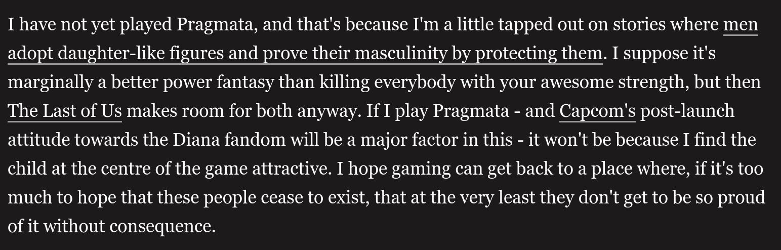 A new meltdown from TheGamer just released about Pragmata, and the activist goes all the way, even coping about Stellar Blade in the article to reject Pragmata, *ahem* because examples of father figures proving masculinity are considered problematic.https://web.archive.org/web/20260422062343/https://www.thegamer.com/pragmata-diana-fan-club-banned-normalised/