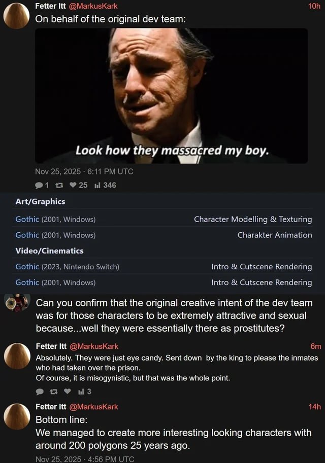 >>533628395Commoids also just can’t fathom the role myths and storytelling have in a civilization. All of our ancestors rallied around wild tales, religions, and myths. Stuff like video games are just the modern equivalent, especially games like this that lean into more classical structures (positive, inspirational characters representing a civic good). These leftoid pieces of shit can’t even conceptualize art unless it’s mindless consumer indulgence or some subversive hit piece on something traditional.