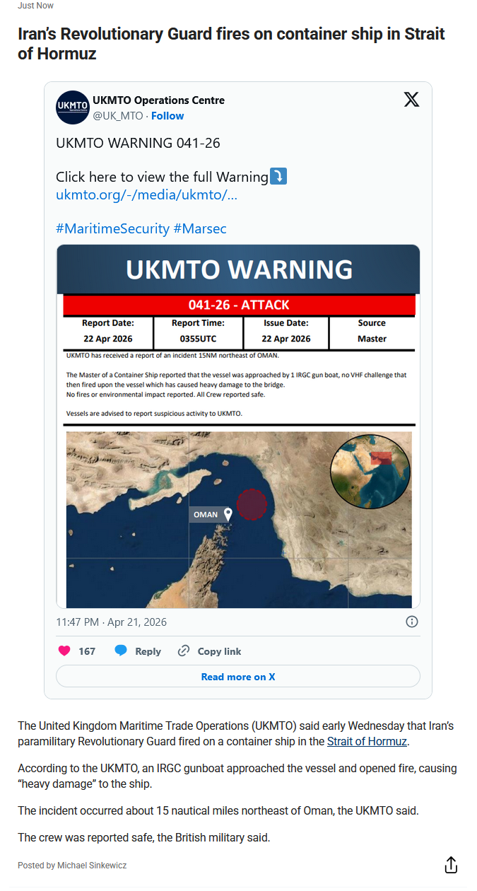 >IRGC vessel approached a container vessel 15 nautical miles northeast of Oman and fired at it, causing heavy damage