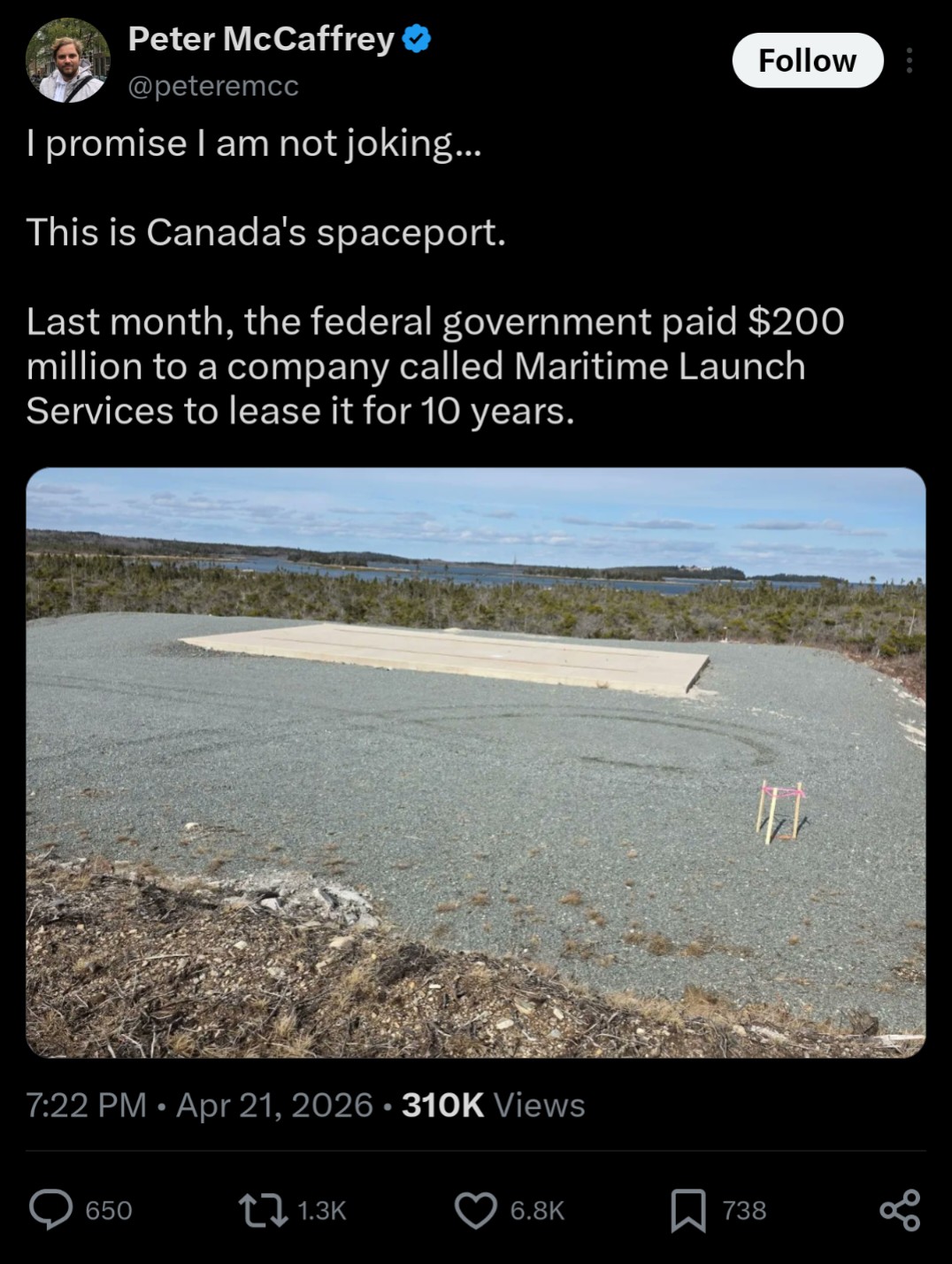 Canada pays $200 million dollars to lease a gravel parking lot for a "space port"