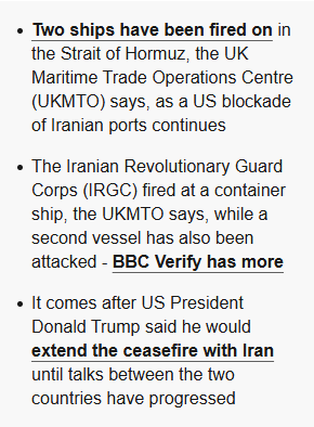 previous cope chamber: >>533621921Day: 15 of the 14-day Ceasefire™ period in IranDay: 53 of the 1-day Special Military Operation™ to decapitate IranDay: 6 of the 10-day Ceasefire™ in Lebanon▶RECENT:>Trump extends ceasefire unilaterally>Iran threatens to completely close Strait of Hormuz>Iran: Won't send delegates to negotiate till US removes navy blockade>Yemen Houthis: Even if the US-Iran ceasefire holds, the larger war will likely continue>POTUS: US forces are “ready to go, militarily” back to war with Iran if no deal is reached by the end of the ceasefire>POTUS: Operation Midnight Hammer was a complete and total obliteration of the Nuclear Dust sites in Iran. Therefore, digging it out will be a long and difficult process>Haley: Touska headed from China to Iran and is linked to chemical shipments for missiles>Iran warns it has new cards if fighting resumes>US Navy destroyer USS Spruance intercepted Iranian-flagged ship TOUSKA in Gulf of Oman. Vessel in US custody▶WARNING:>Do not trust any "happenings" without link/proof▶Oil:>https://oilprice.com/oil-price-charts▶Kino:https://files.catbox.moe/og2wvv.mp4https://files.catbox.moe/dqr3fl.mp4https://files.catbox.moe/jg9rat.mp4https://files.catbox.moe/fx86zj.mp4https://files.catbox.moe/cbd7ug.mp4https://files.catbox.moe/2hwzcx.mp4https://files.catbox.moe/smmsfw.mp4https://files.catbox.moe/x0fbgv.mp4https://files.catbox.moe/86yxn2.mp4▶Live-streams:https://www.youtube.com/watch?v=4E-iFtUM2kk https://www.youtube.com/watch?v=TdcrT5OcS9c https://www.youtube.com/watch?v=53G-Oy4r6M4 ▶Telegram Channelshttps://rentry.org/tgnews▶Israel Rocket Alertshttps://www.tzevaadom.co.il/en▶Air Traffichttps://www.flightradar24.comhttps://flightaware.com/livehttps://globe.adsbexchange.com▶Maritime Traffichttps://www.marinetraffic.comhttps://www.vesselfinder.com
