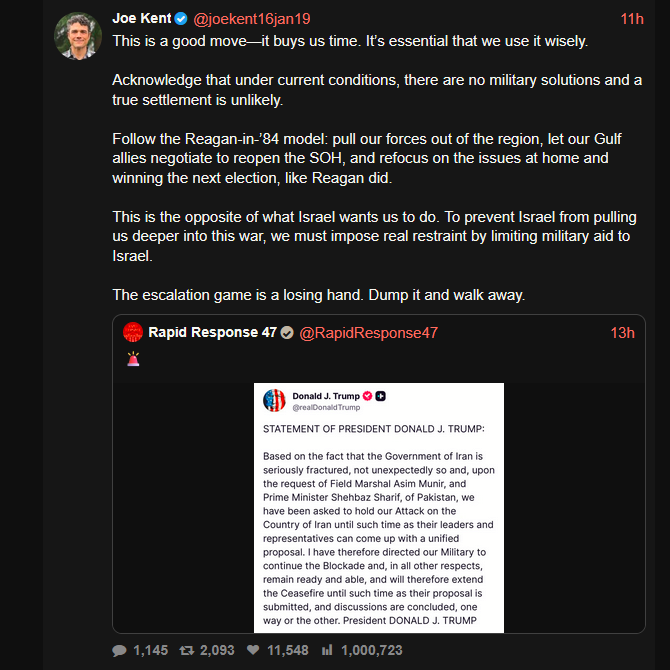 >>533633778the US empire can't stop for posture reasons and they won't stop until they paid a price in blood not treasure I suspectyou think the US can act on joe kents advice who laid it out plain and simple how solve it?just stop the US blockade, have the local figure out how to open the strait and only defend israel (if they are acting purely defensive)Joe might not know the number of lakes in his districts but he knows that serving likud is treason for americans.We call him honest Joe CIA here.