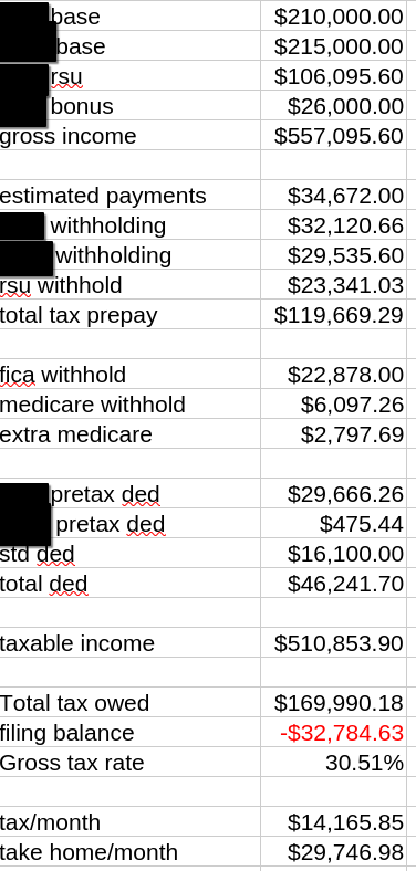 >>533648995I’m buying a house with room to grow investments run a side gig, rent previous property, and apply up to bigger jobs. Why would I be anywhere else? Give it 5 years and Imm on track to be able to live however I want in anywhere that isn’t a city. It’s a good life if you can do it. I’m not complaining about myself, but merely pointing out that year a lot of people are mid 6 figures and it is tighter than you’d think. My take home is not including RSU’s or withholding for 401k or 529’s. I’m doing good. My employer matching alone is more than some people make. I feel that because I used to be poor. I do not squander my wealth and am grateful for what I have. Could use some more breathing room in my cashflow though damn.