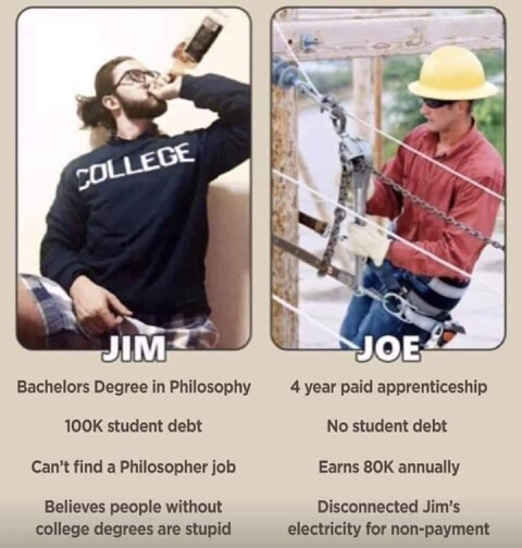 college is a massive meme and a scam in a lot of cases but you need to go through it to get your certificate here. like 90% of the stuff they taught me in electrical is stuff i dont need to know on the job and a lot of job related things i do need to know are things im going to have to learn on the job because they never came up in class.Genuinely, the entire classroom content could be skipped and you could be ready to be an electrical apprentice. The worst part is that at my college we had some professional teacher guy teaching an electrical class and he knew nothing about electrical, the college was just hiring him because they had so many students they couldnt fit them all into the class with the real electrician. My "professor" even said that in college or university you either get someone who is knowledgeable in the field or you get someone who knows how to teach. So my teacher was an actual electrician who also had teaching experience and the other class was a teacher guy who didnt know the material well enough to answer questions and apparently like 10% of the class were failing the classroom and their shop work was garbage too.if you can get straight into apprenticeship because of nepotism then i would say to do it, there are programs to do that sort of thing.
