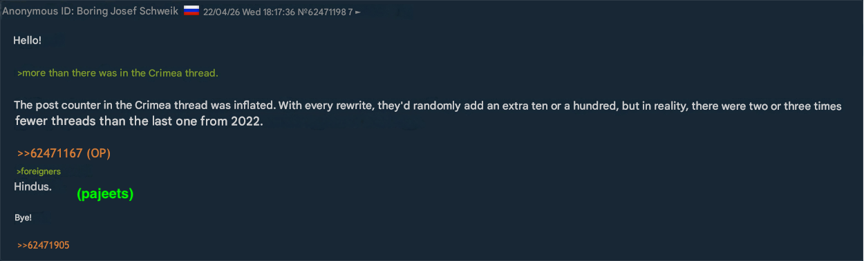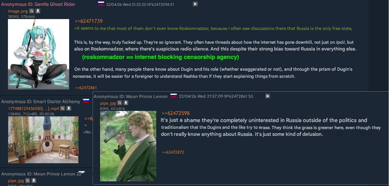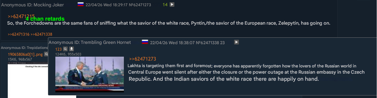 >>533666229I remember visiting that website with seemingly anti-regime userbase called joyreactor. Left one comment in 2022 suggesting them that maybe it's finally time to actually do something and got shadowbanned instantly.>>533666275I don't know, its like 80% lakhtabots baiting retards with anime pics, and other 20% are various browns hating the west (and us for some fucking reason)