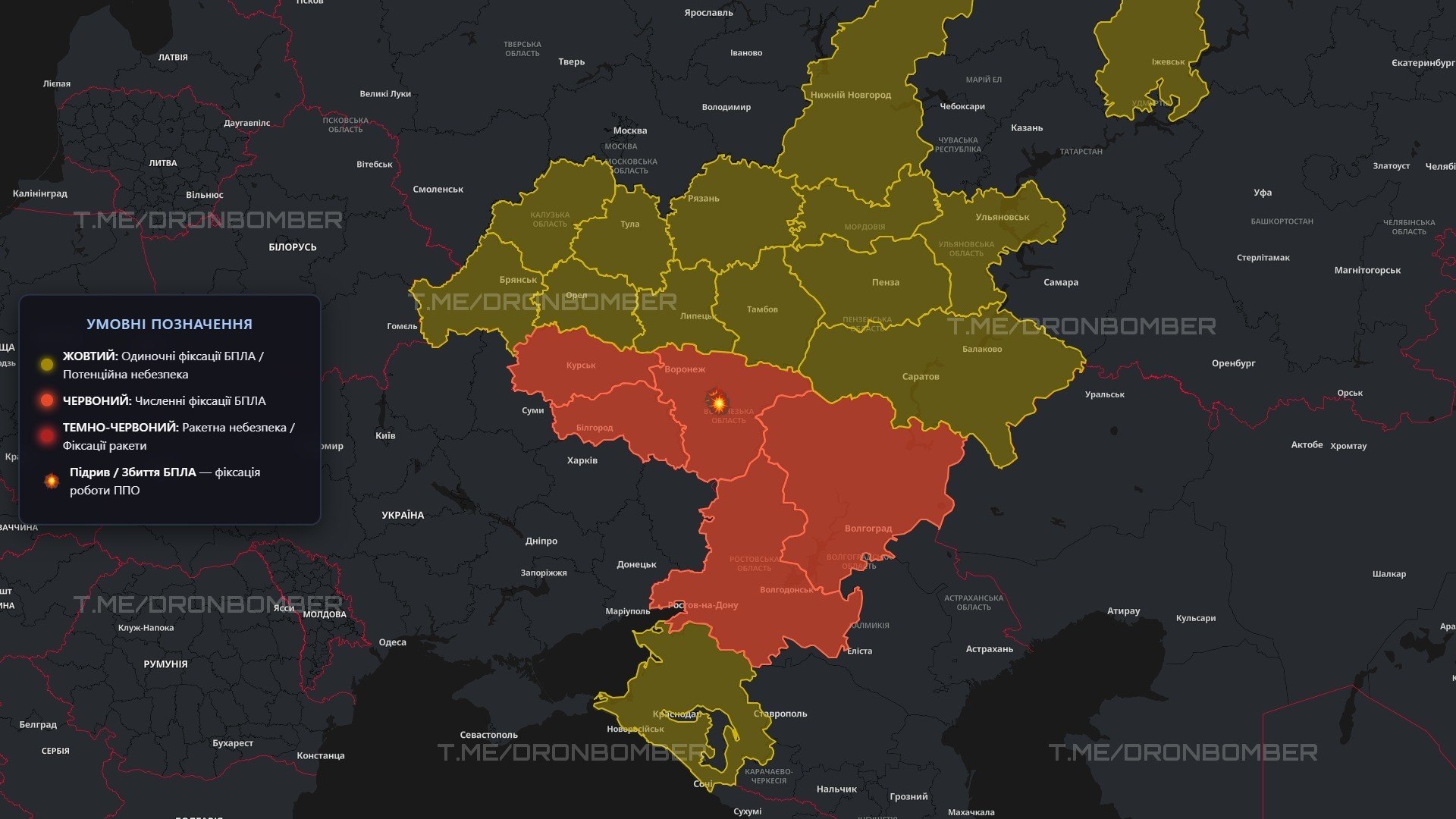 >23:15 | 22/04, air alert in the swamps:>Monitors are again reporting a large number of drone detections, you can see this on the map.>Many are reporting on the work of the air defense system, but no one has seen missiles for a long time. They are just trying to shoot them down with machine guns, which is not very successful..