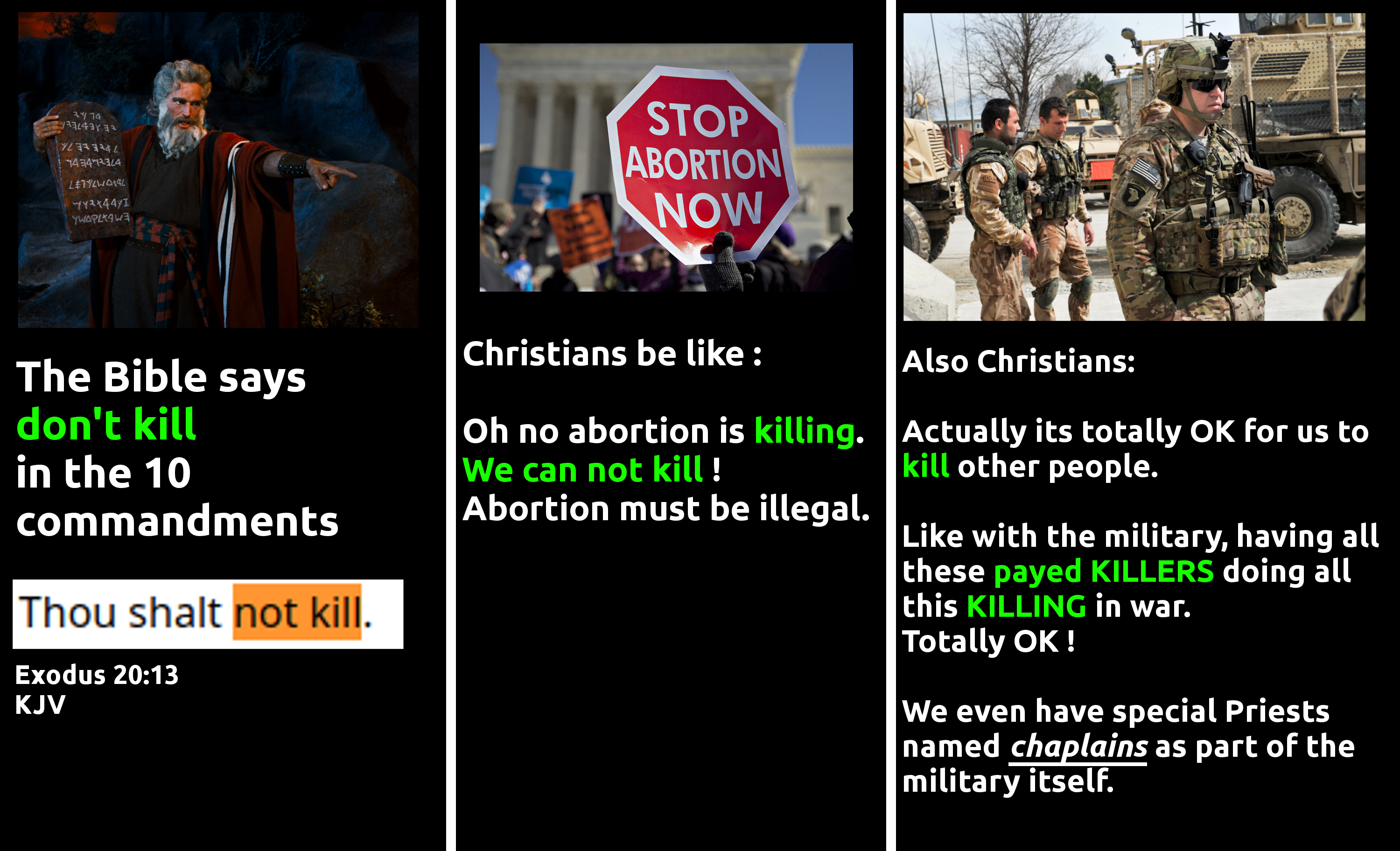 >>533663588The verses in your meme is mistranslated. It's not kill, it's murder. However, killing through the military is still unlawful because Jesus commanded you to love your enemies.