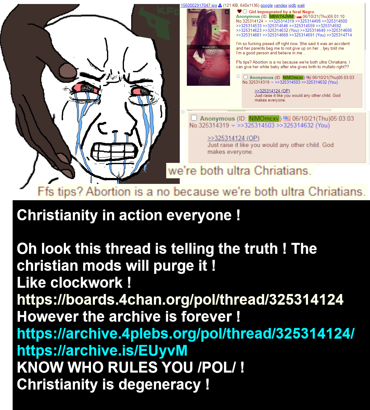 >>533665553>NOOO that is not real!Then what do you do if your trad christian bride fucks a nigger and gets pregnant?Real question!>REEEEChristians can never answer. Anti-abortion is pure degeneracy!