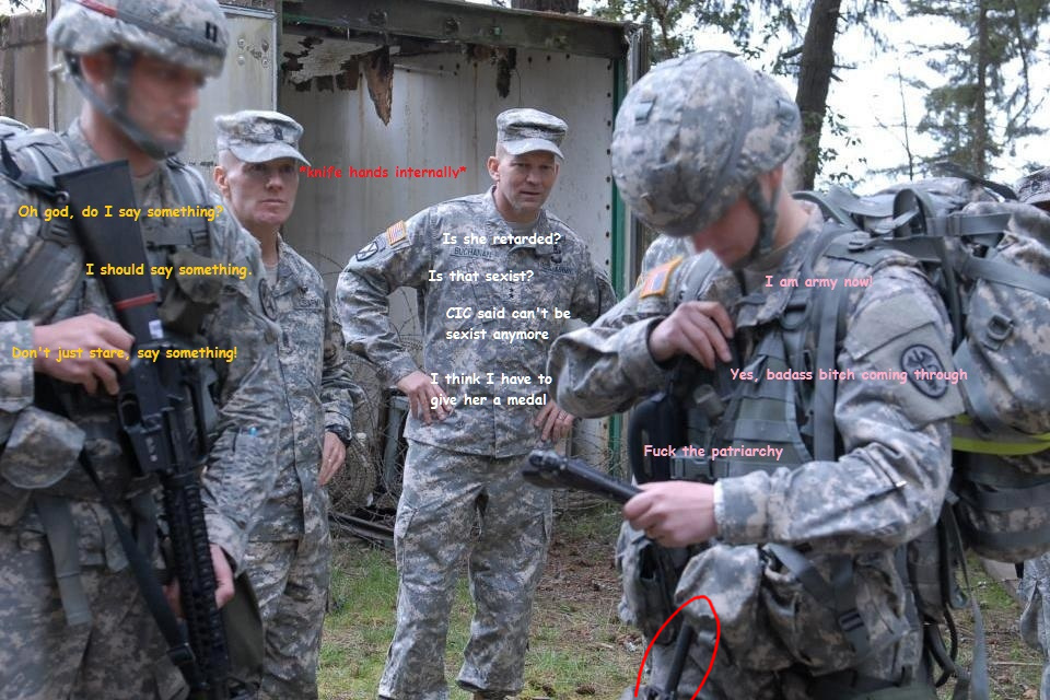 >>533670747I remember on /k/ (before it was taken over by glowing trannies) where some enlisted men were talking about how miserable it was that women could force men to carry their PT ruck-sacks and other gear by threat of sexual assault allegations. Basically PT training was complete hell if there was a woman in the unit.